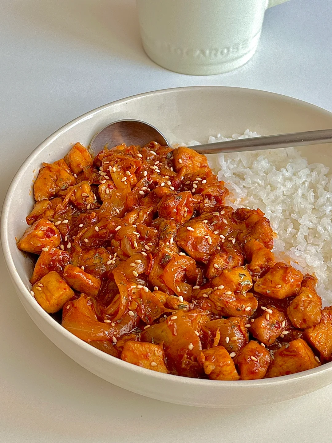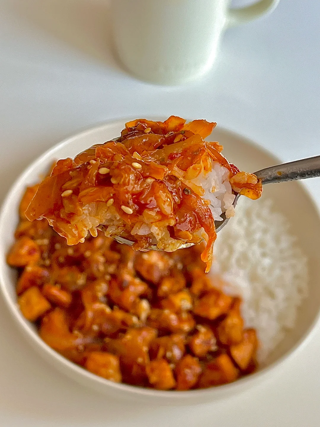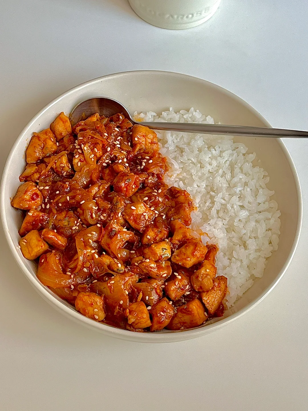 我家的春天真好吃 今日份一人食健康餐分享: 韩式辣白菜鸡肉拌饭 一杯茉莉花茶 . 食材:一块鸡胸肉 洋葱 辣白菜 韩式辣酱 做法如图上⬆️ . 有条件的把鸡胸肉换成鸡腿肉,会hi 好吃😋 都去给我做,这个真的巨下饭好吃😋