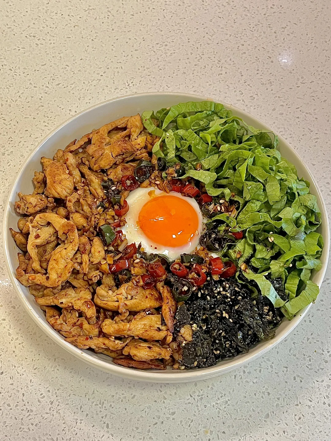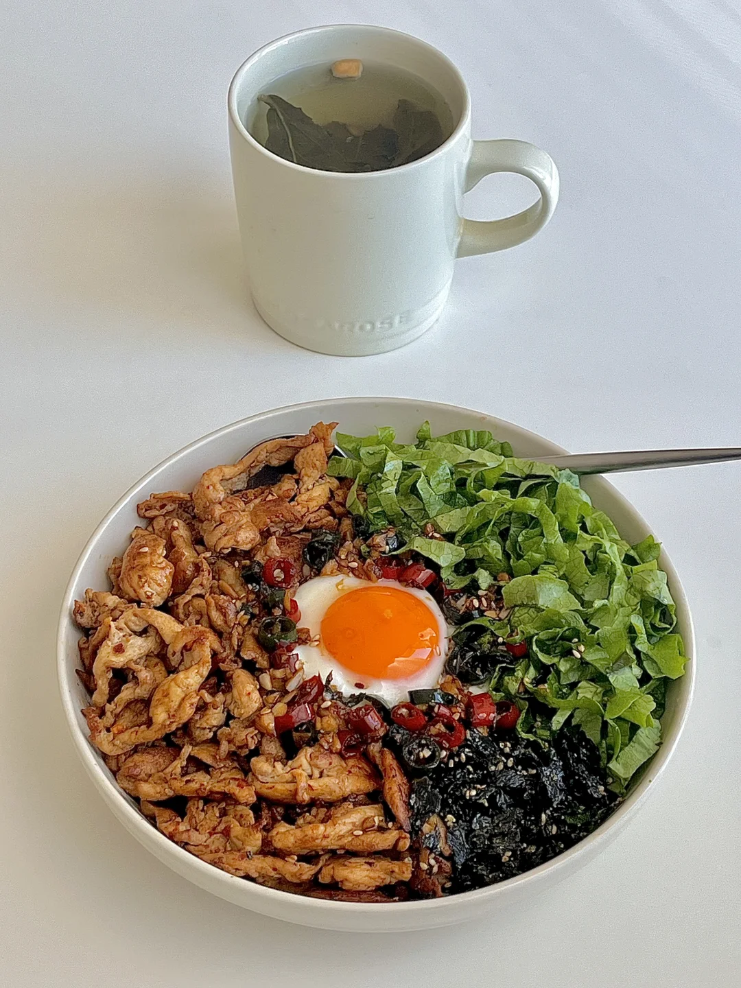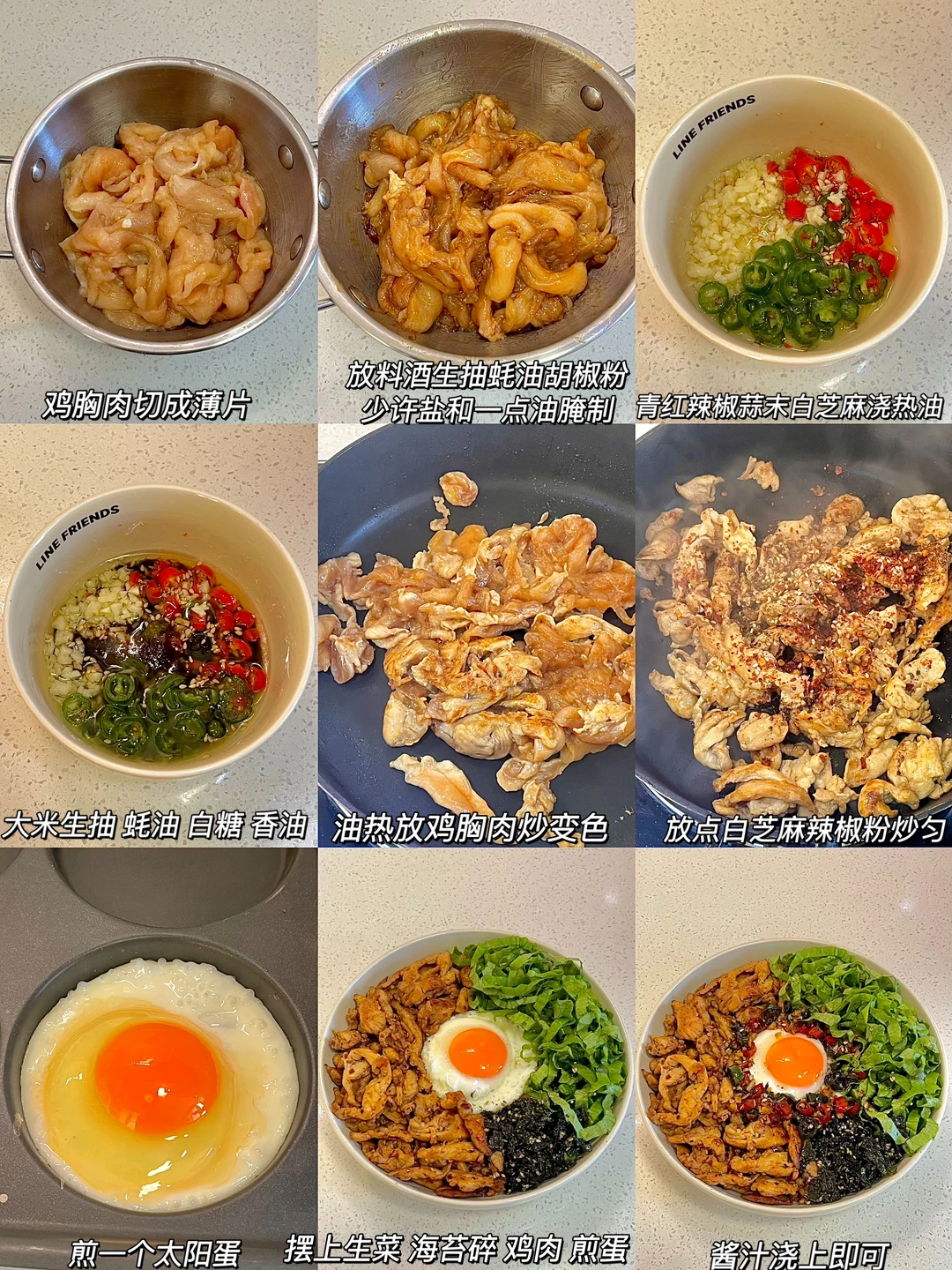 做菜我是认真的 粗茶淡饭最养人 今日份一人食健康餐分享: 鸡肉生菜拌饭 一杯茉莉果茶 . 食材:鸡胸肉120克 鸡蛋一个 生菜 海苔碎 做法如图上⬆️ . 上次做的是牛肉生菜拌饭,今天做个鸡胸肉的,味道也不错哦,要把鸡胸肉切薄片炒出来才不会那么柴😋