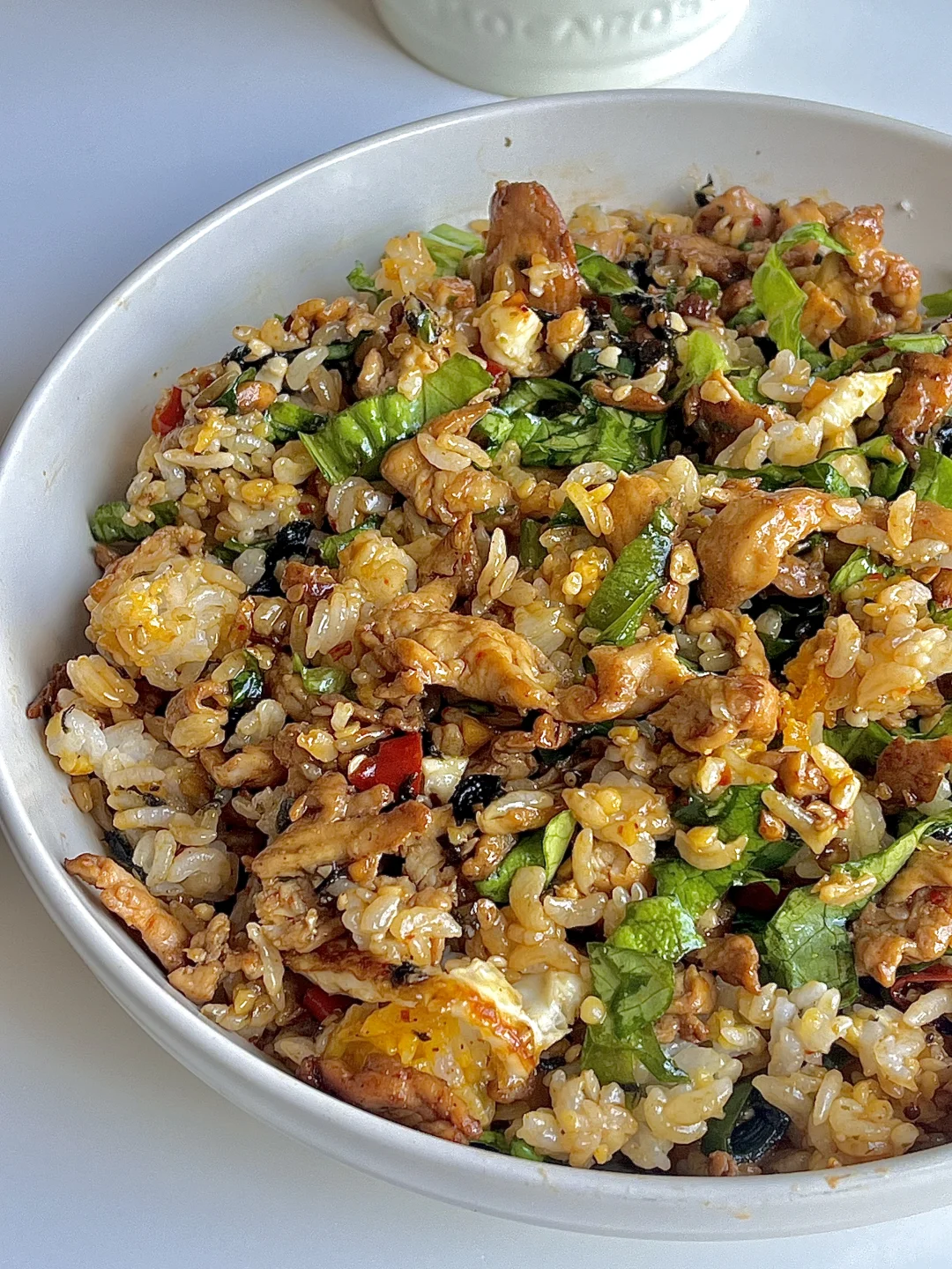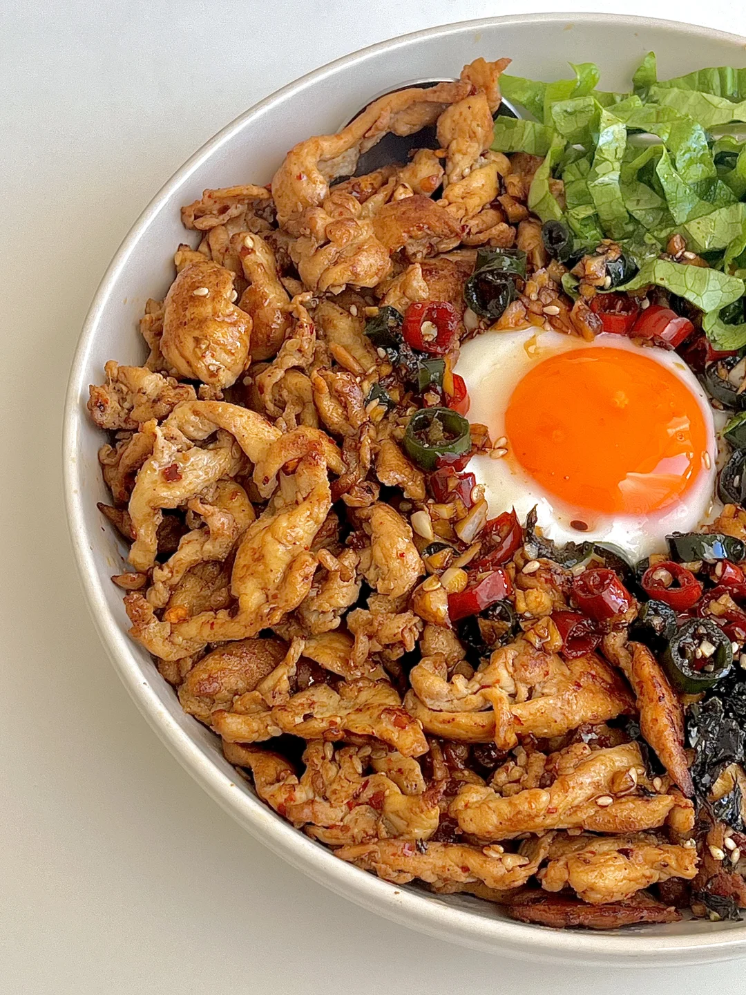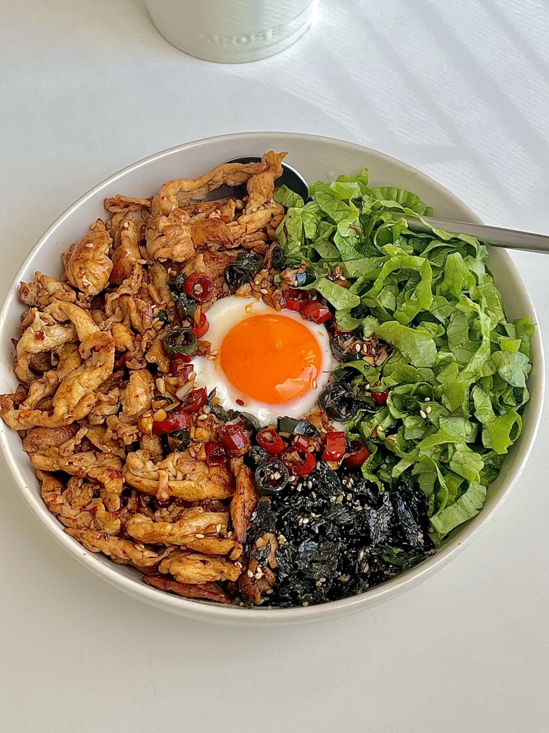 做菜我是认真的 粗茶淡饭最养人 今日份一人食健康餐分享: 鸡肉生菜拌饭 一杯茉莉果茶 . 食材:鸡胸肉120克 鸡蛋一个 生菜 海苔碎 做法如图上⬆️ . 上次做的是牛肉生菜拌饭,今天做个鸡胸肉的,味道也不错哦,要把鸡胸肉切薄片炒出来才不会那么柴😋