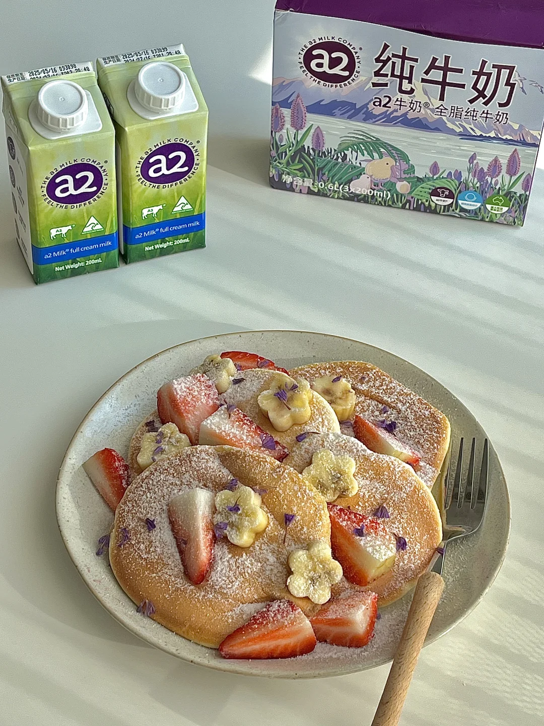 吃顿冬日漂亮饭 今日份一人食健康餐分享: 舒芙蕾松饼🥞 一杯拿铁☕️ . 食材:两颗鸡蛋 20毫升牛奶 20克低筋面粉 15克白糖 做法:请看图4️⃣5️⃣ . 平底锅就能做的软乎乎的舒芙蕾松饼🥞家里的小宝宝也可以放心吃哦! 今天用到的牛奶是🥛a2全脂纯牛奶 它还是a2奶源🐮100%生牛乳0添加 奶香浓郁,口感丝滑~全家都可以喝! 澳洲进口a2源乳品质高,宝宝转奶期也敲放心的, 蛋白亲和肠胃易吸收宝宝速转奶!