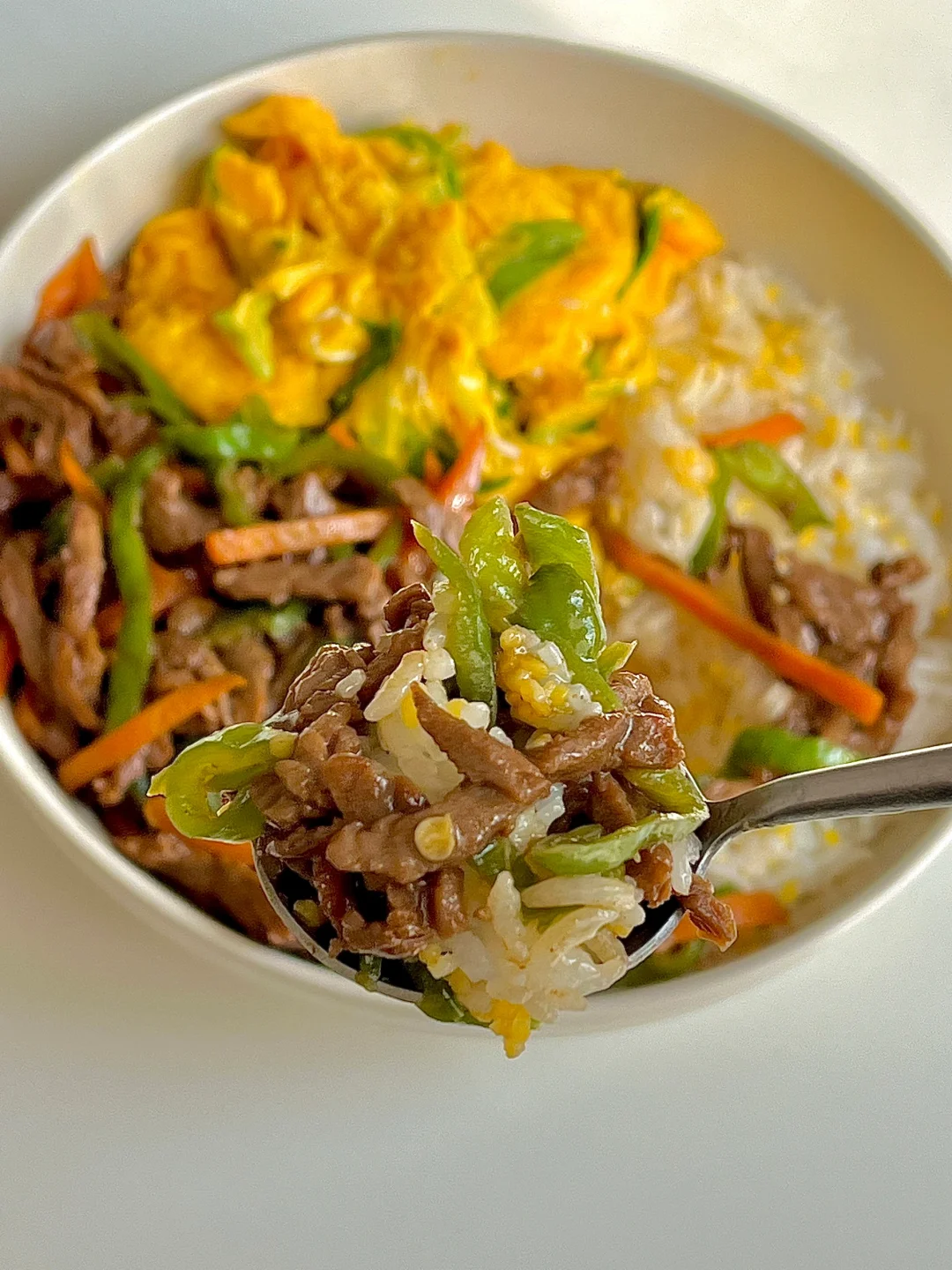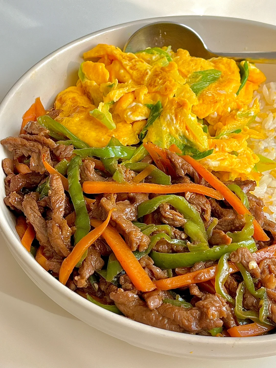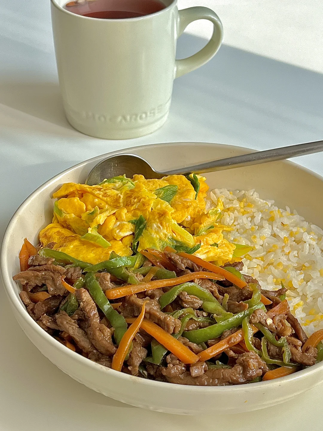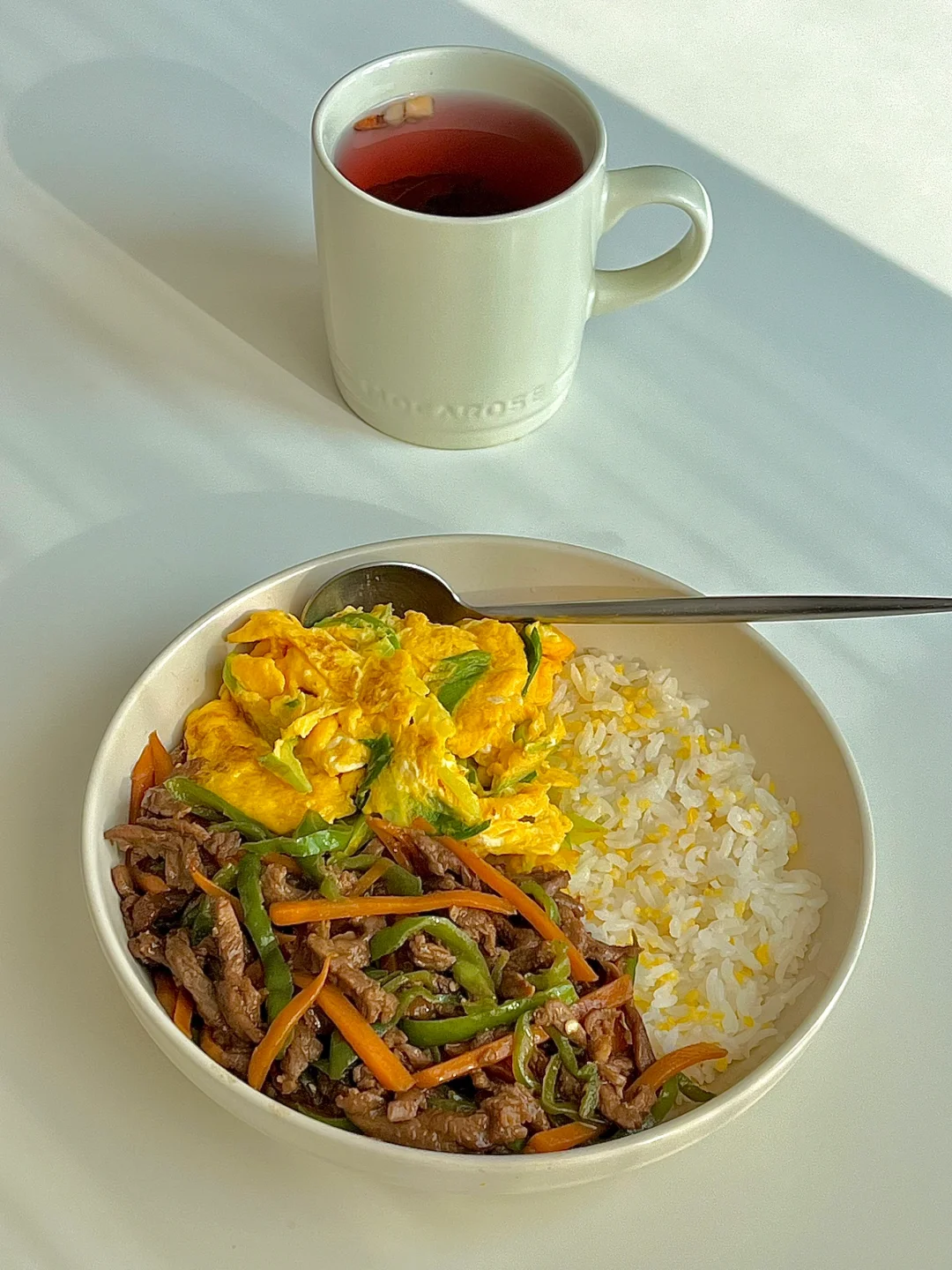 做菜我是认真的 粗茶淡饭最养人 今日份一人食健康餐分享: 辣椒胡萝卜炒牛肉 大葱炒鸡蛋 玉米碴米饭🍚 一杯玫瑰果茶 . 食材:一根螺丝椒 半根胡萝卜 150克牛肉 蒜瓣儿2个 两个鸡蛋 半根大葱 做法如图上⬆️ 不清楚做法的也可以评论区留言! . 炒牛肉腌制一定要加葱姜花椒水,炒出来很嫩哦😋 还是吃干净饭得劲!