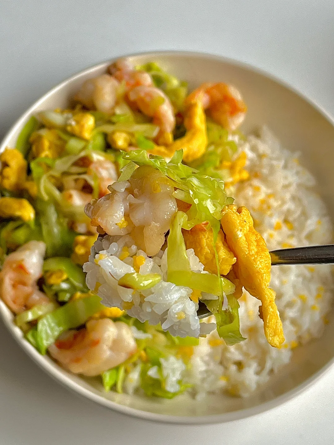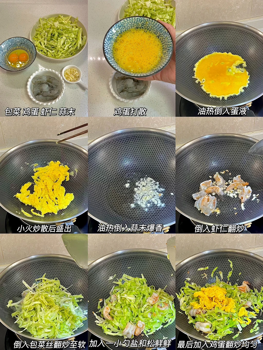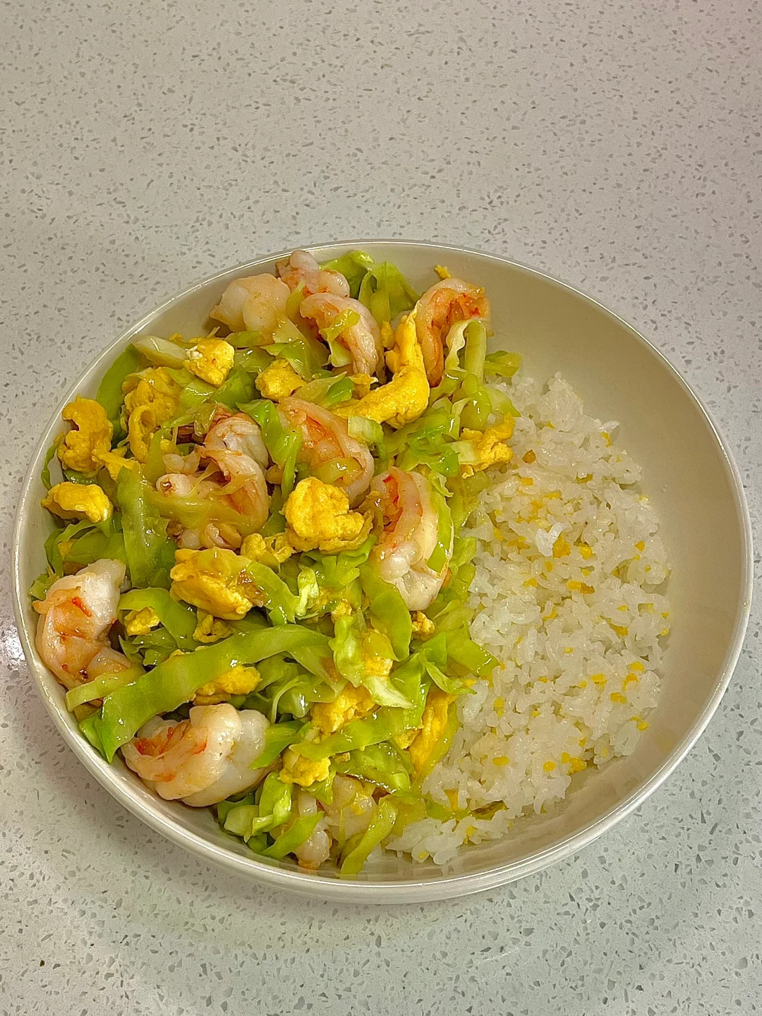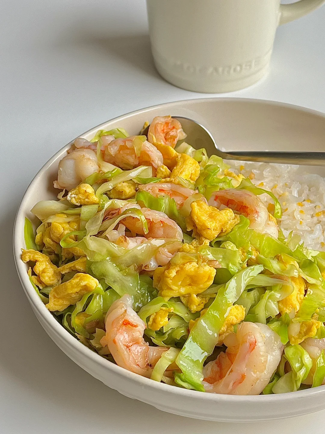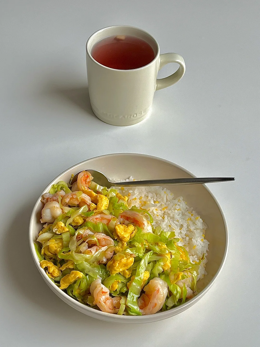 做菜我是认真的 粗茶淡饭最养人 今日份一人食健康餐分享: 包菜虾仁炒鸡蛋 玉米碴米饭🍚 一杯玫瑰果茶 . 食材:小半颗包菜切丝 两个鸡蛋 5个大虾仁 两瓣蒜 做法如图上⬆️ 上次做的包菜虾仁炒鸡蛋大家都很喜欢,我也很喜欢吃,今天换了大虾仁,鲜美😋