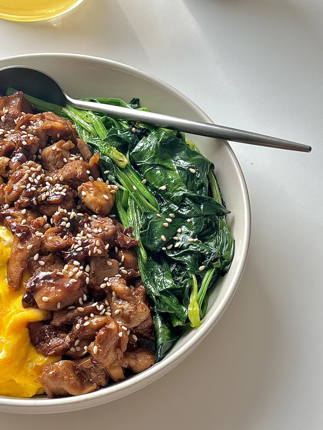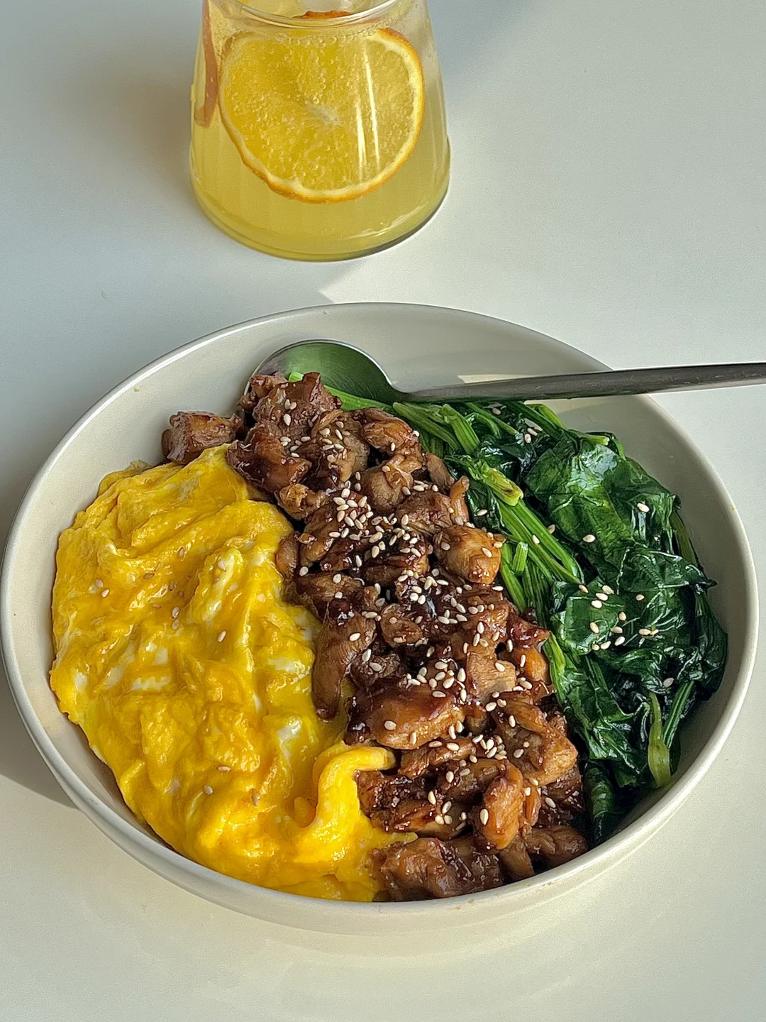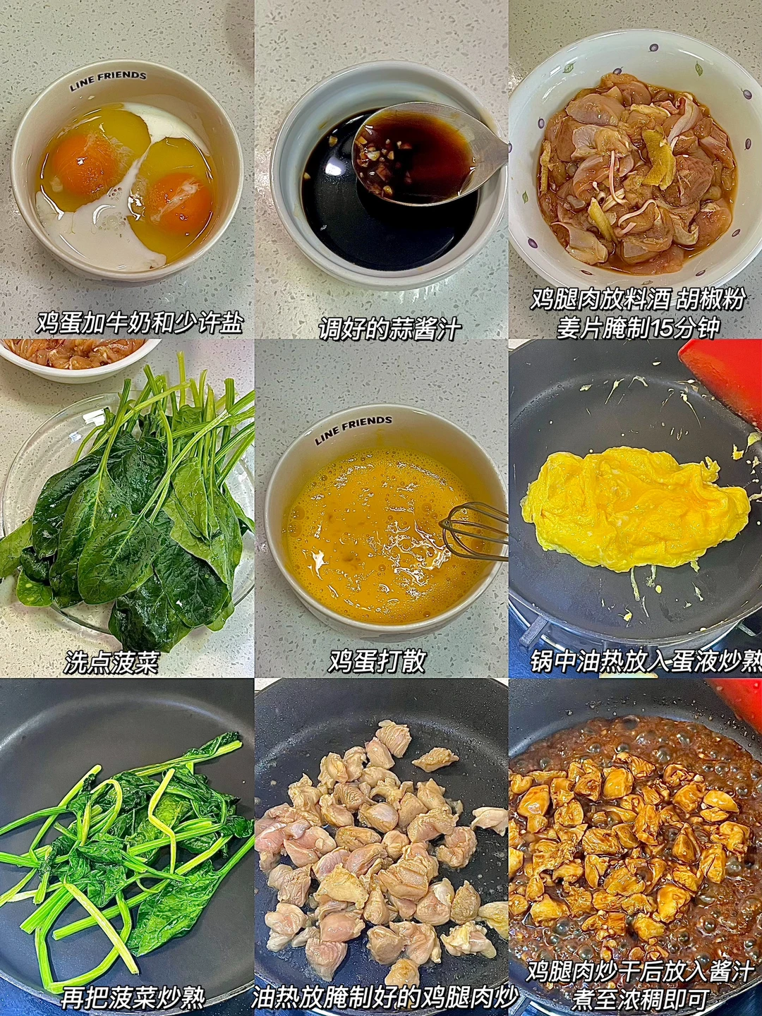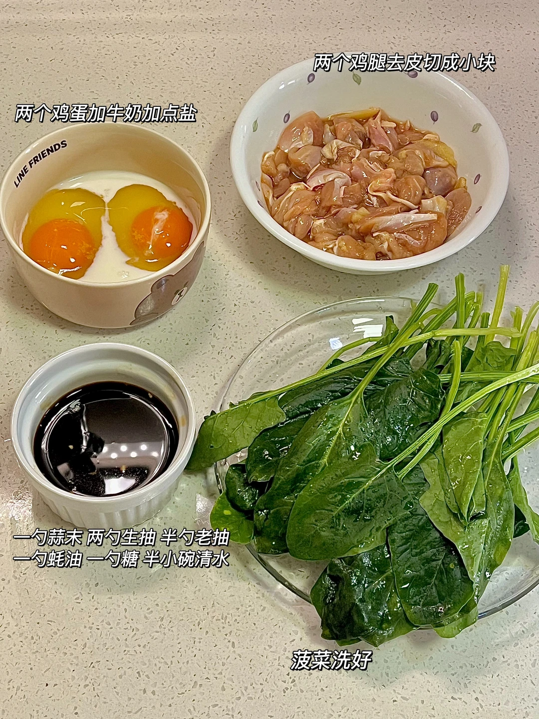 两个鸡蛋 两个去骨去皮鸡腿 菠菜 酱汁(两勺生抽 一勺蚝油 半勺老抽 一勺白糖 半小碗清水 一勺蒜末)