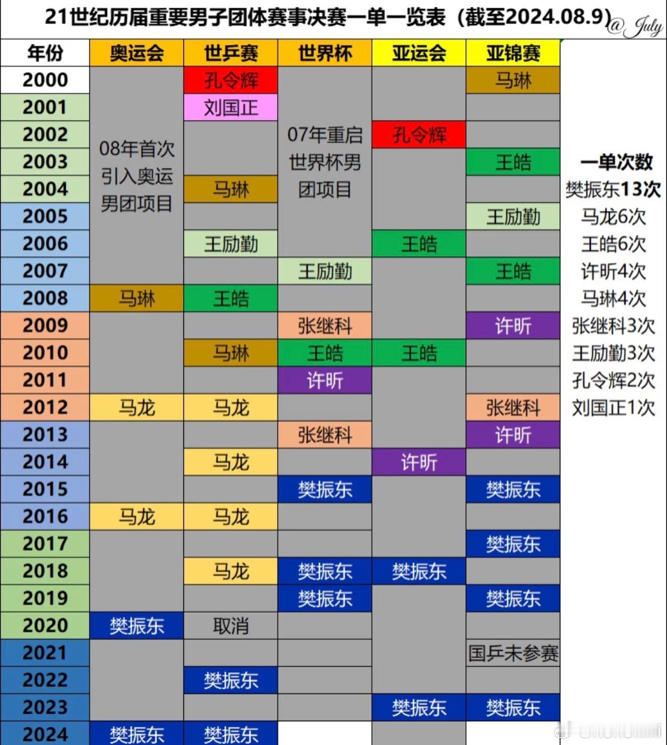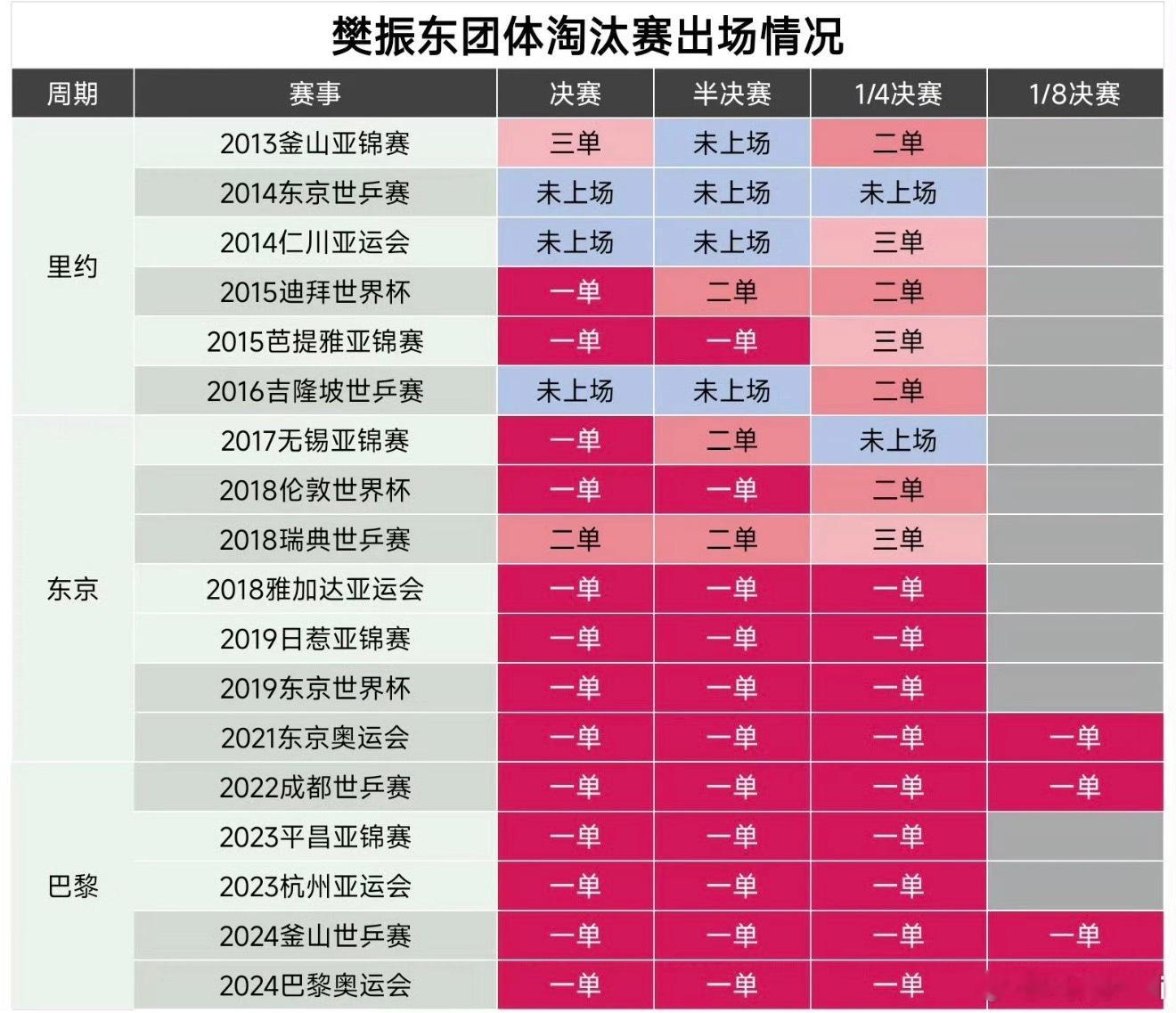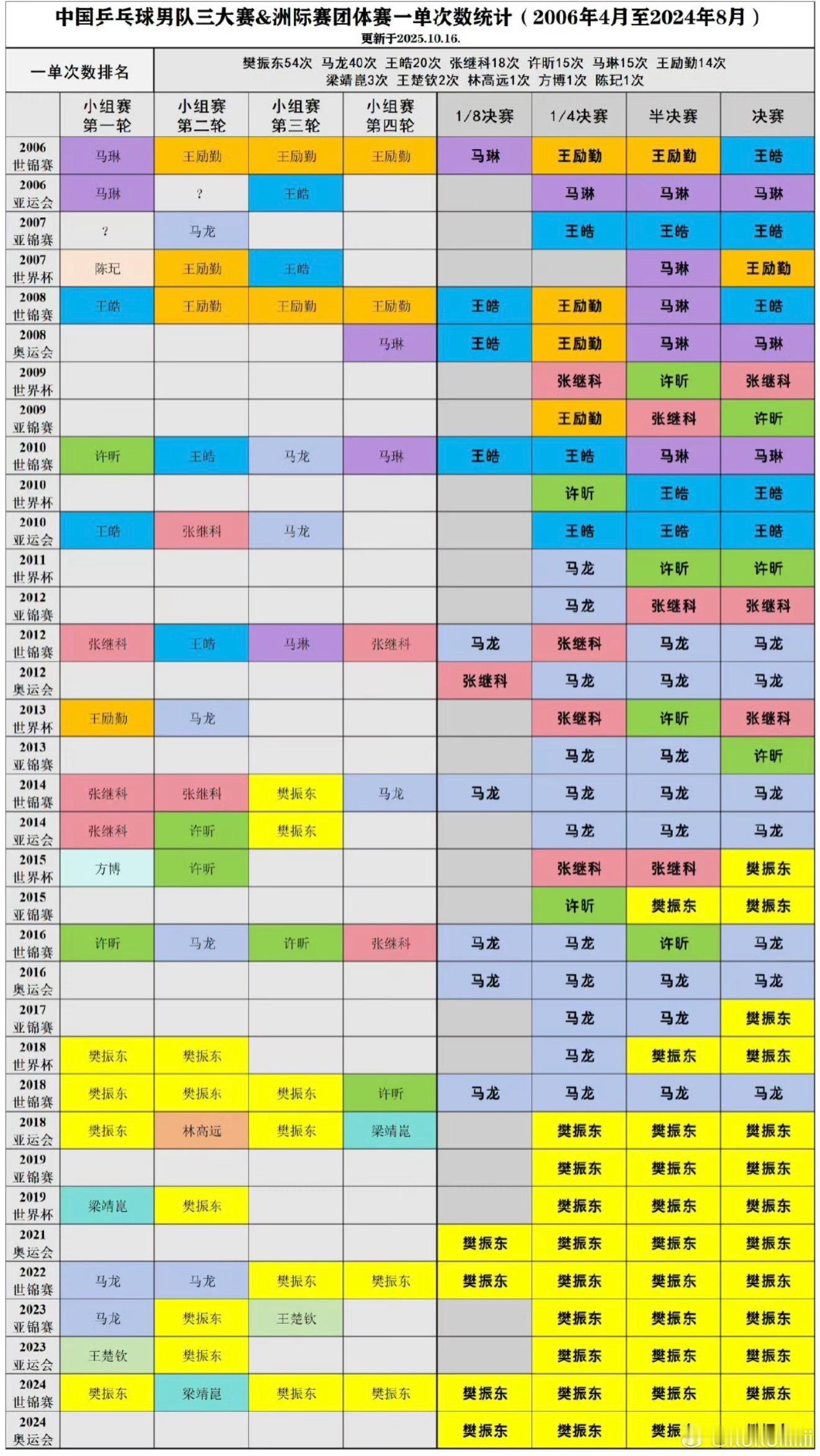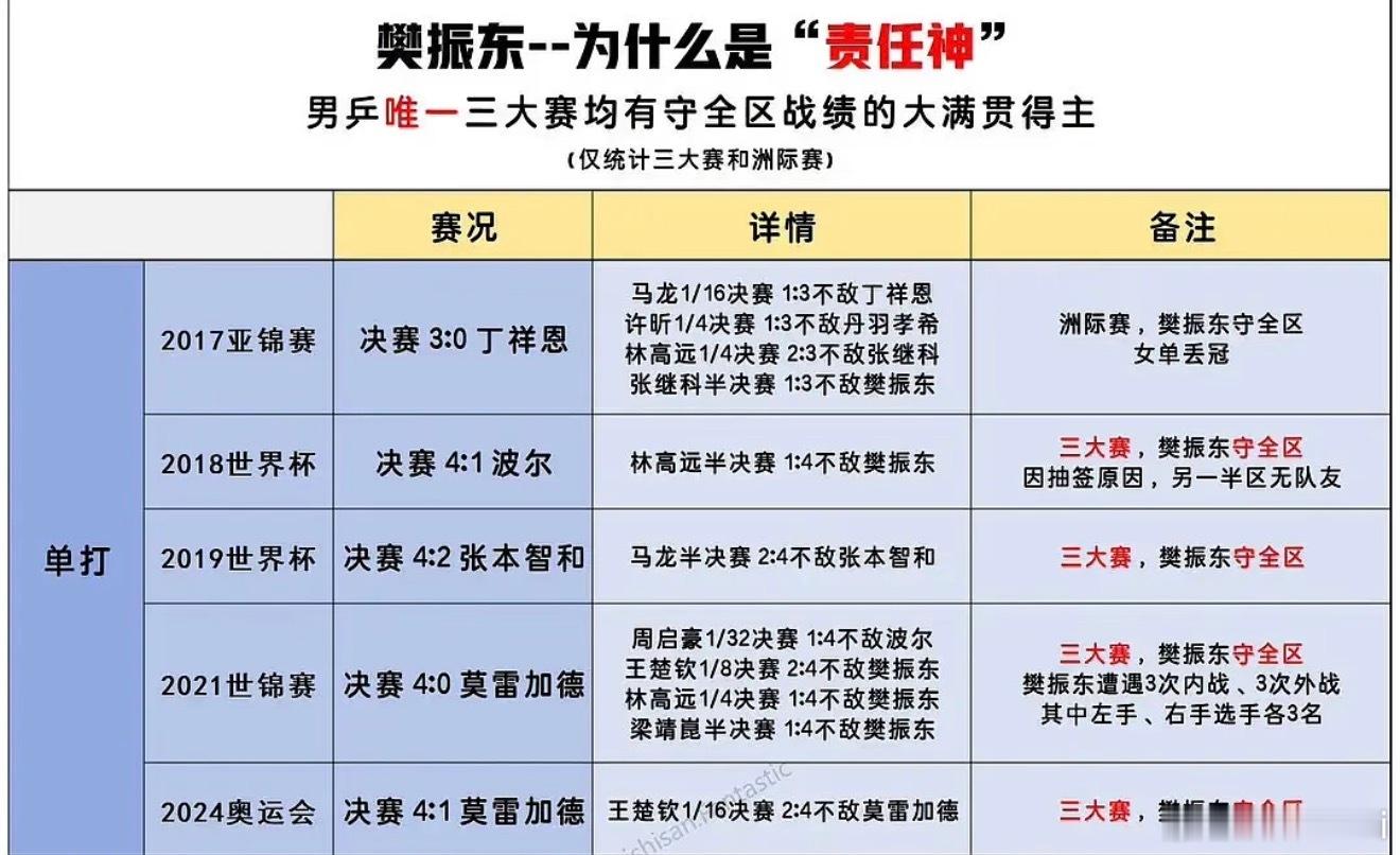做不到这地步的别说自己扛旗,比赛多≠扛旗。国际三大赛樊振东独守全区四次,最终全部夺冠,分别是2018年世界杯 、2019年世界杯、2021年世乒赛和2024年奥运会。团体赛担任54次一单,为国乒男队之最。