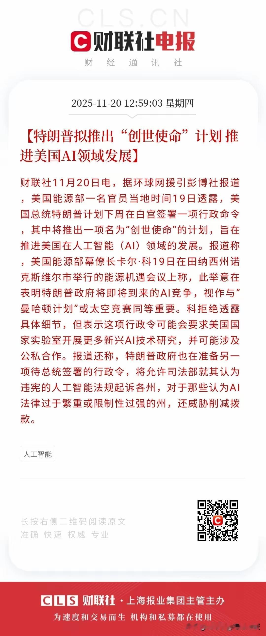 特朗普的野心不止是加密货币世界第一啊!最近特朗普又要签署一份行政命令,名字叫“创世使命”计划,看起来是很恢宏的使命,旨在推进美国AI领域的发展,对于限制AI的州还要威胁削减拨款。 特朗普心中只将中国视为AI竞争对手,在美国的大厂,AI首席科学家基本都是华人,一辈子争强好胜的特朗普怎么能让美国在AI领域甘于落后?特朗普的任期内,在加密货币和AI领域同时发力是肯定的,只是资本市场科技股泡沫太严重,美股三大指数连跌多日,一点也不给特朗普面子。
