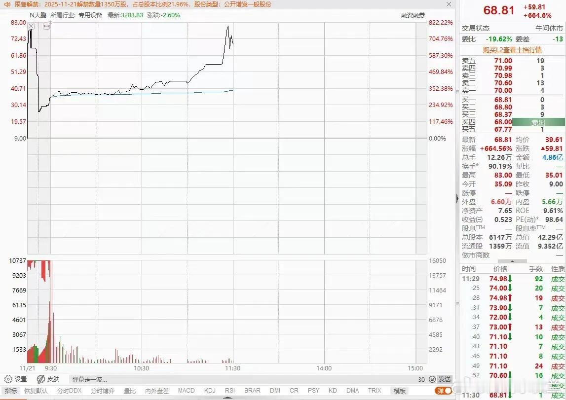 今天上午新股N大鹏炒作太疯狂了!早盘集合竞价大涨289.89%。上午收盘大涨664.6%。盘中两次触发临时停牌。上午换手率高达90.19%。发行价9元,开盘价35.09元,最低价35.01元,最高价83元,上午收盘68.81元。按照发行价计算,盘中最大涨幅超过800%;按照开盘价计算,盘中最大涨幅超过100%。盘中两次临时停牌,完全没有抑制市场的炒作,也没有让投资者冷静,股价仍然高举高打,一路上涨。最关键的是,上午换手率超过了90%,下午还能有多少卖盘?流通盘小是N大鹏上市首日遭到爆炒的主要原因,发行量1500万股,首日上市仅1359万股。参与新股上市首日炒作的风险巨大,从A股历史来看,多数新股上市首日的最高价,基本都是该股未来几年的最高价。当然,也有少数例外,但是赔钱的概率明显更大。