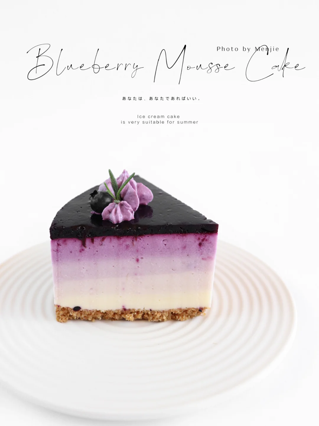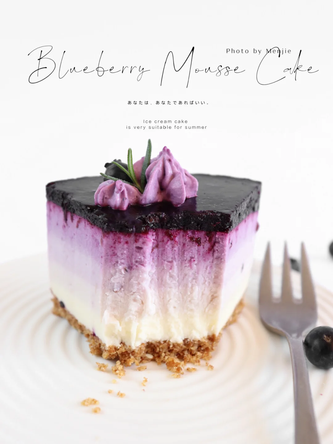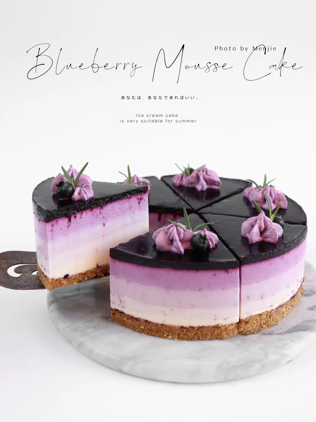 ❼将3g吉利丁隔水融化,与90g的蓝莓酱混合均匀,倒入凝固好的慕斯蛋糕顶层,入冰箱冷藏4小时以上脱模后,进行装饰即可。