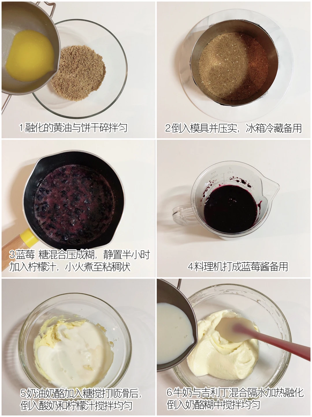 ❷蓝莓与糖混合压成糊,静置半小时后加入柠檬汁,小火煮至粘稠状,料理机打成蓝莓酱备用。