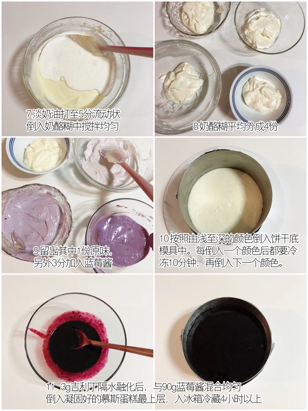 ❺淡奶油打到5分流动状,倒入奶酪糊中搅拌均匀后,平均分成4份,留出其中1份原味,另外3份加入适量蓝莓酱,做成渐变的颜色。