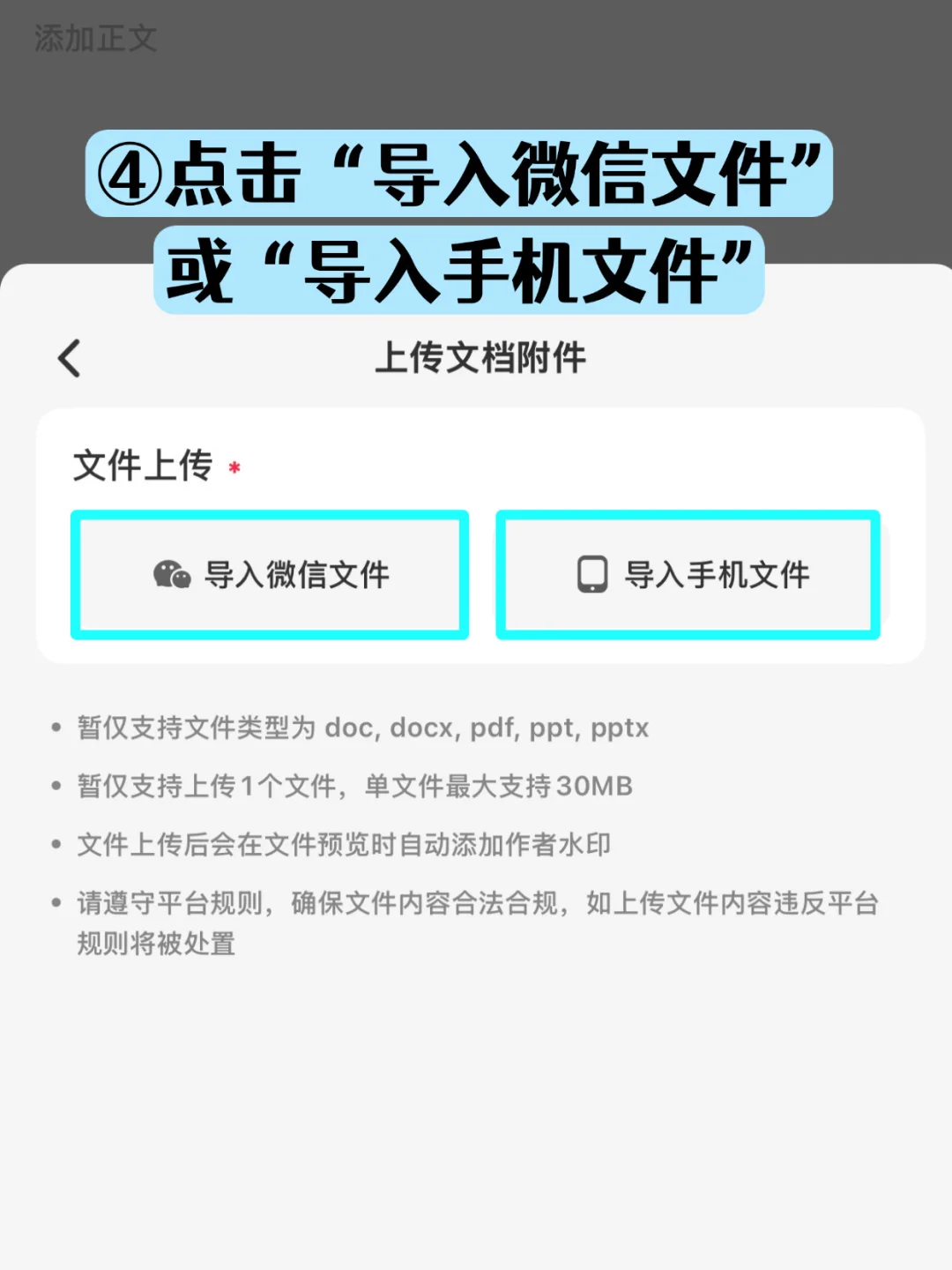 ❗️注意:目前仅支持pdf、doc、docx、ppt、pptx格式,且只能上传1个文件,文件大小不能超过100MB,已过期聊天文件不支持上传。