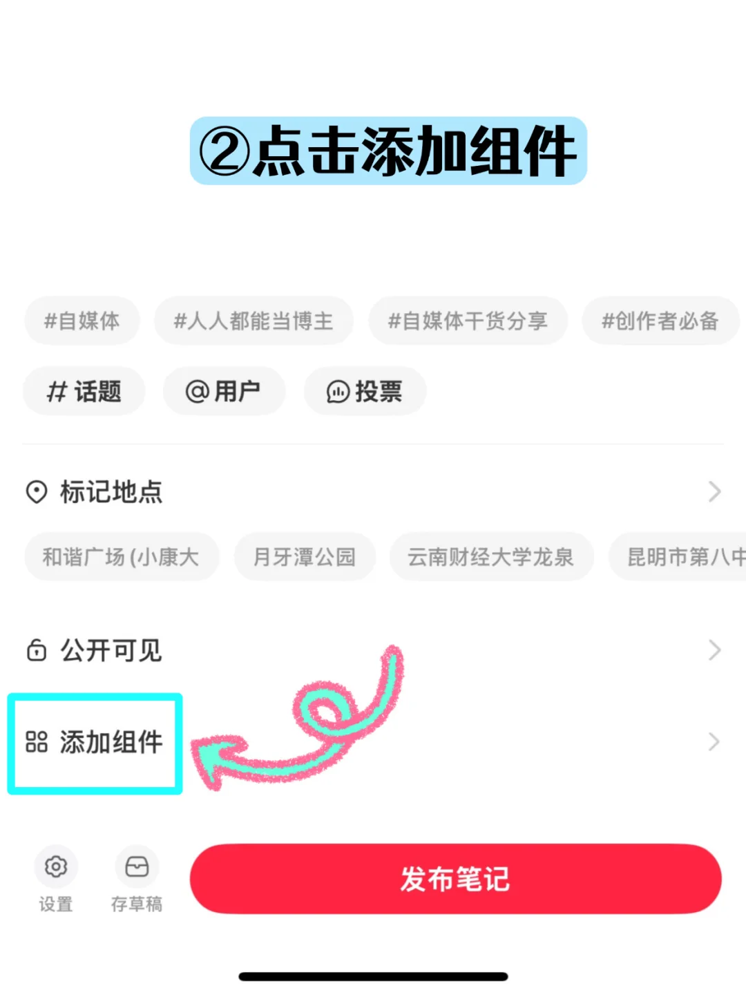 2️⃣ 进入到笔记编辑页面,点击「添加组件」 →