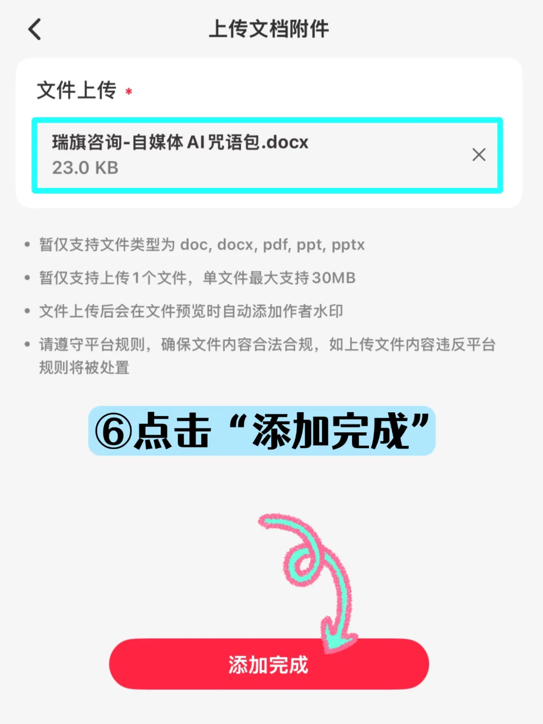 6️⃣ 点「添加完成」 → 写标题+正文+话题 → 发布!