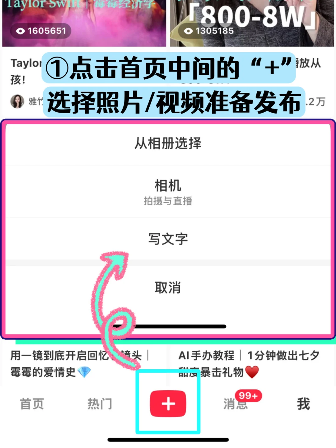 1️⃣ 点首页底部菜单栏中的「+」号 → 选择要发布的图片或视频;