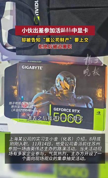 小伙出差参加活动抽中显卡,却被告知“属公司财产”要上交,拒绝后被迫离职。 公司的做法也是没错的,这个是公司委派过去参加活动,开销也都是公司报销,如果没有中奖,双方都无话可说。中奖了,上交上去也无可厚非,但是这个也可以协商。 无关奖品价值多少的问题,双方为人处世的问题,这个虽说是3000不多,那如果是三万 三十万,或者三百万呢。 这个又该怎么讲呢,没有公司作为平台你也去不了。很多键盘侠在那讲公司抠,流程来讲公司做法没问题。