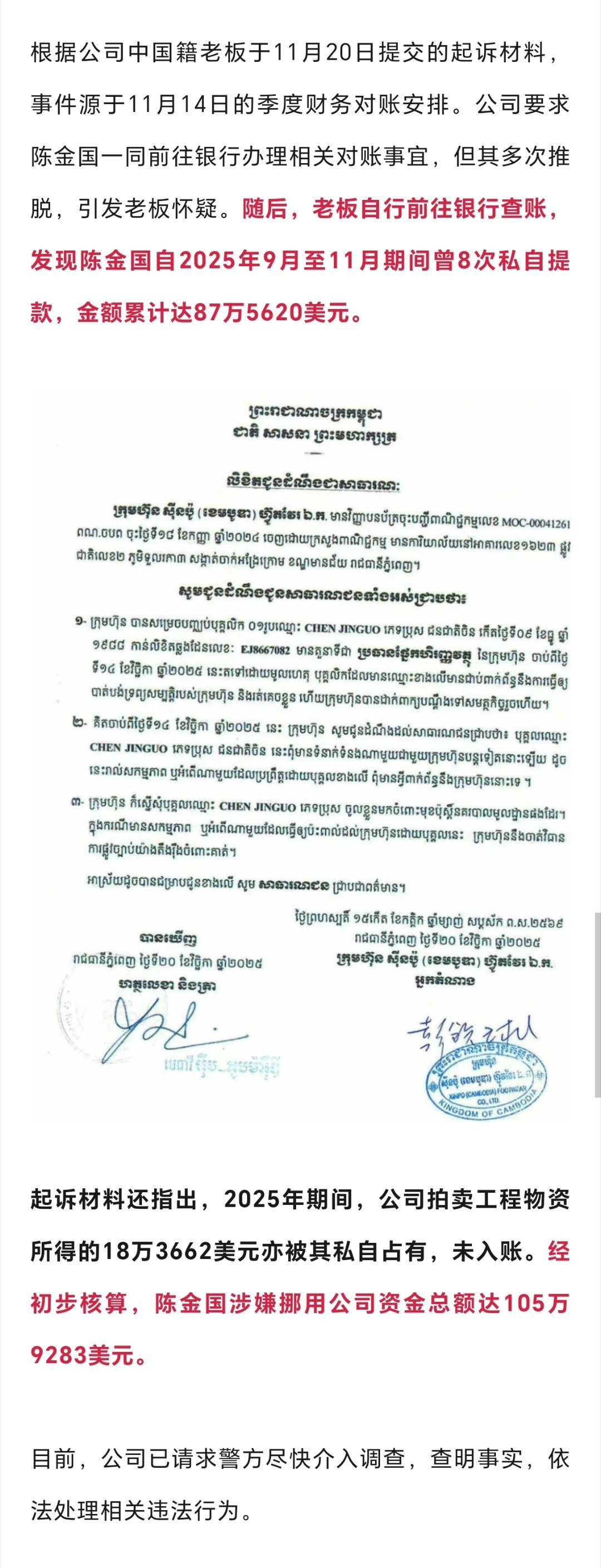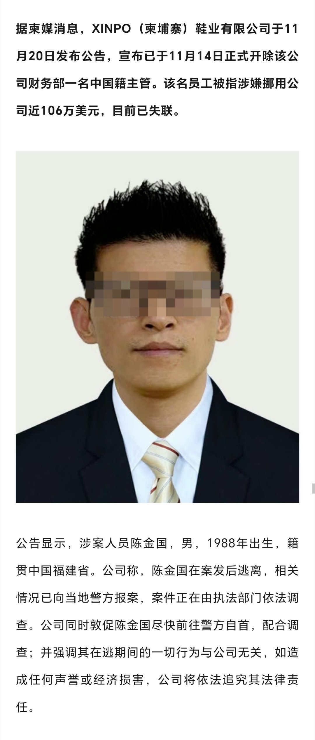 一男子在柬埔寨涉嫌挪用公司近106万美元后失联。