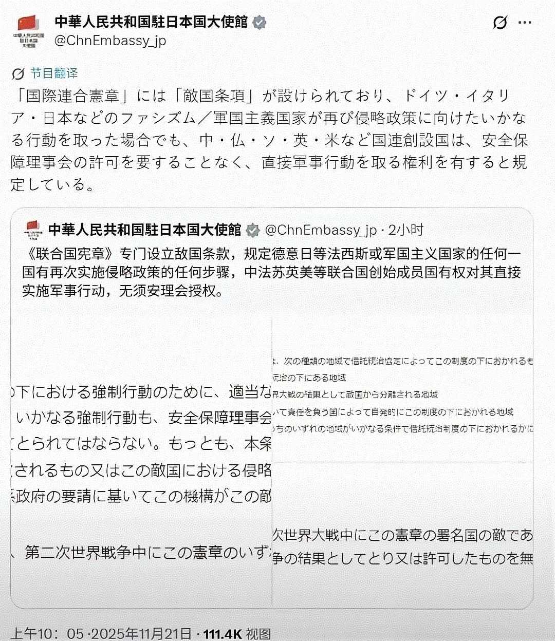 最新,中国驻日大使馆今天(11月21日)发文写道:“《联合国宪章》专门设立敌国条款,规定德意日等法西斯或军国主义国家的任何一国有再次实施侵略政策的任何步骤,中法苏英美等联合国创始成员国有权对其直接实施军事行动,无须安理会授权。” 该条款写进1945年文本第53条、第107条,当时针对德意日可能死灰复燃。2025财年日本防卫预算7.95万亿日元,连涨13年,其中远程导弹采购费增至3234亿,比去年多四成,被周边视为“突破专守”的实际步骤。 2024年12月,日德签署《物资劳务相互提供协定》,自卫队补给舰首次驶入基尔港;2025年3月,东京宣布2027年前在九州部署美制“战斧”,射程1600公里,覆盖上海、平壤,引发俄外交部点名批评“复活进攻能力”。 敌国条款虽仍有效,但创始五常内部已分裂:英法与美结盟,日美又签有安保条约,中俄若单独援引条款动武,将在安理会遭遇否决,现实政治成本极高,条文更多成为外交威慑符号。 2025年10月,自卫队与澳军在北马里亚纳举行“利刃”联合登陆,参演兵力3800人,为冷战后最大规模,中方智库指出,若年度演习持续扩大,理论上可构成“侵略步骤”的举证材料,但国际社会是否认同仍取决于证据链与程序。 条文是历史留下的安全闸门,真正起作用的是实力平衡:当防卫预算增速连续13年超GDP增长,当射程千公里的导弹真的搬上本土,任何条款都会被重新翻开,关键在于是停留在纸面,还是被现实触发。