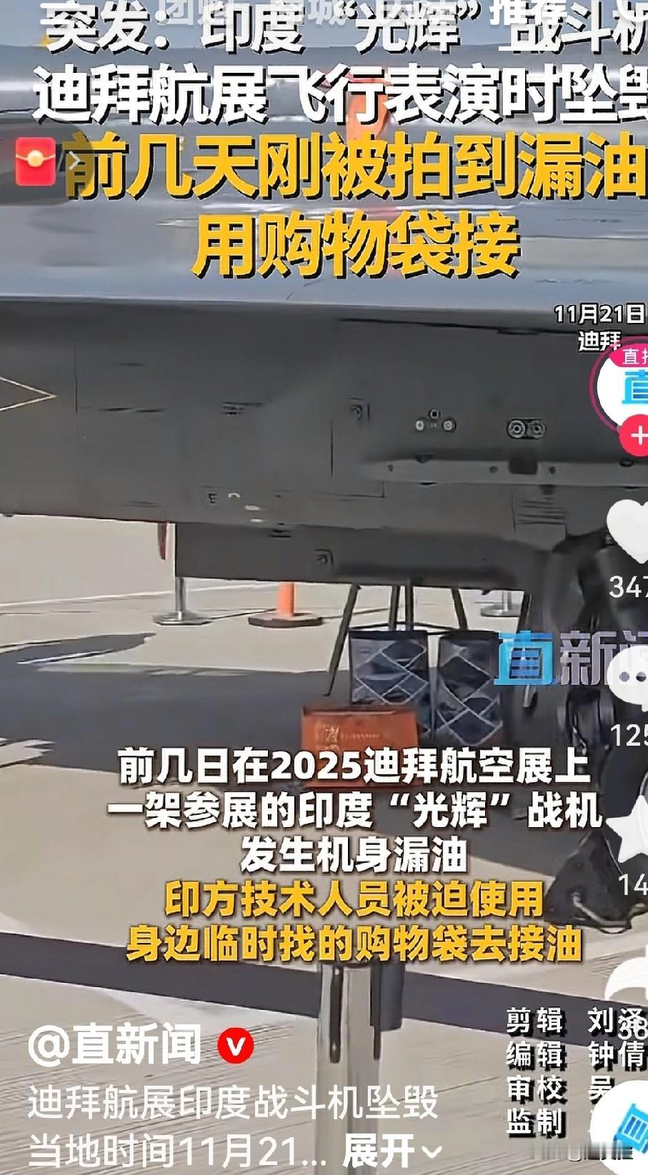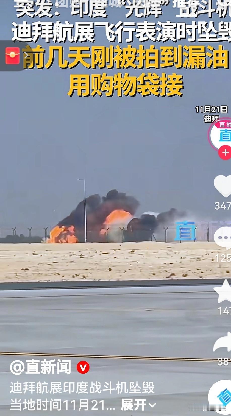 迪拜航展印度光辉战斗机在表演时坠毁,摔了爆炸起火了,看样子很惨,飞行员可能身亡。据多家媒体报道,前天就有记者拍到他们的飞机漏油用购物袋子接着。这莫迪该头大了。估计军方领导人死的心都有。毕竟印巴冲突中被巴基斯坦击落的飞机被曝光后很丢丑,嘴巴强硬没用。可惜飞行员有点无辜啊。冒充强大,自大高傲,自吹自擂,虚荣投机,狐假虎威,在军事上只能意味着死亡。恐怖。