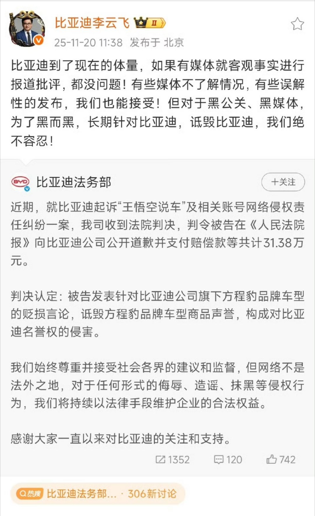王悟空说车因恶意贬损比亚迪方程豹被判赔31万+公开道歉,这波判决大快人心!!网络从来不是法外之地,有些自媒体为了蹭流量、博眼球,拿着不实信息恶意抹黑车企,不仅误导消费者,还打乱了行业正常竞争秩序,纯属行业“毒瘤”。比亚迪能接受合理的监督和批评,但对这种“为了黑而黑”的长期诋毁零容忍,果断用法律维权,真的又刚又清醒!中央网信办整治汽车行业网络乱象、关闭一批恶意账号,也印证了“歪风邪气早该清”的共识。技术竞争才是良性之争啊!新能源汽车产业发展不容易,企业本该把精力砸在续航、智能、安全这些硬核研发上,总被黑公关纠缠只会分流资源,拖慢行业进步。支持车企硬刚黑公关!只有肃清这些歪风,让技术创新、品质提升成为竞争主流,行业才能越走越远,消费者也能拿到更真实的信息、更优质的产品,这才是真正的多赢局面~