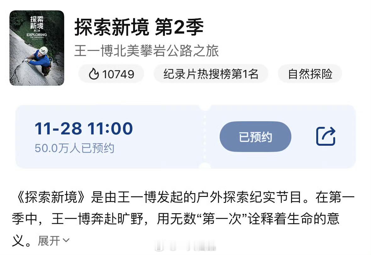 王一博探索新境2预约破50w,是首部破50w的纪录。含金量无需多言,牛掰