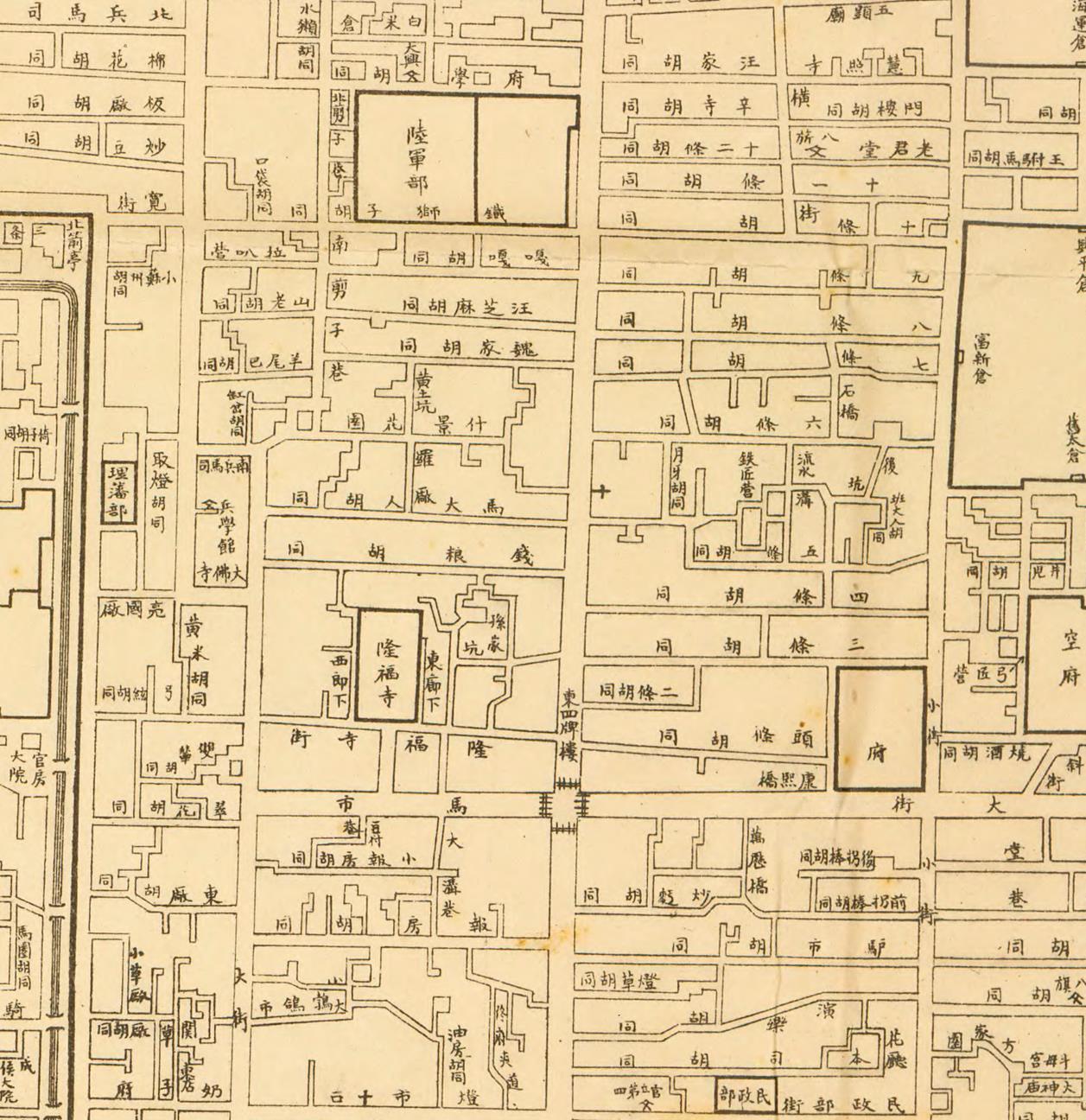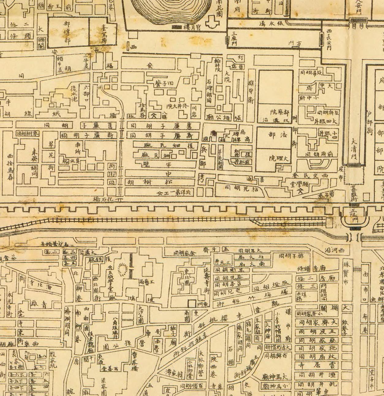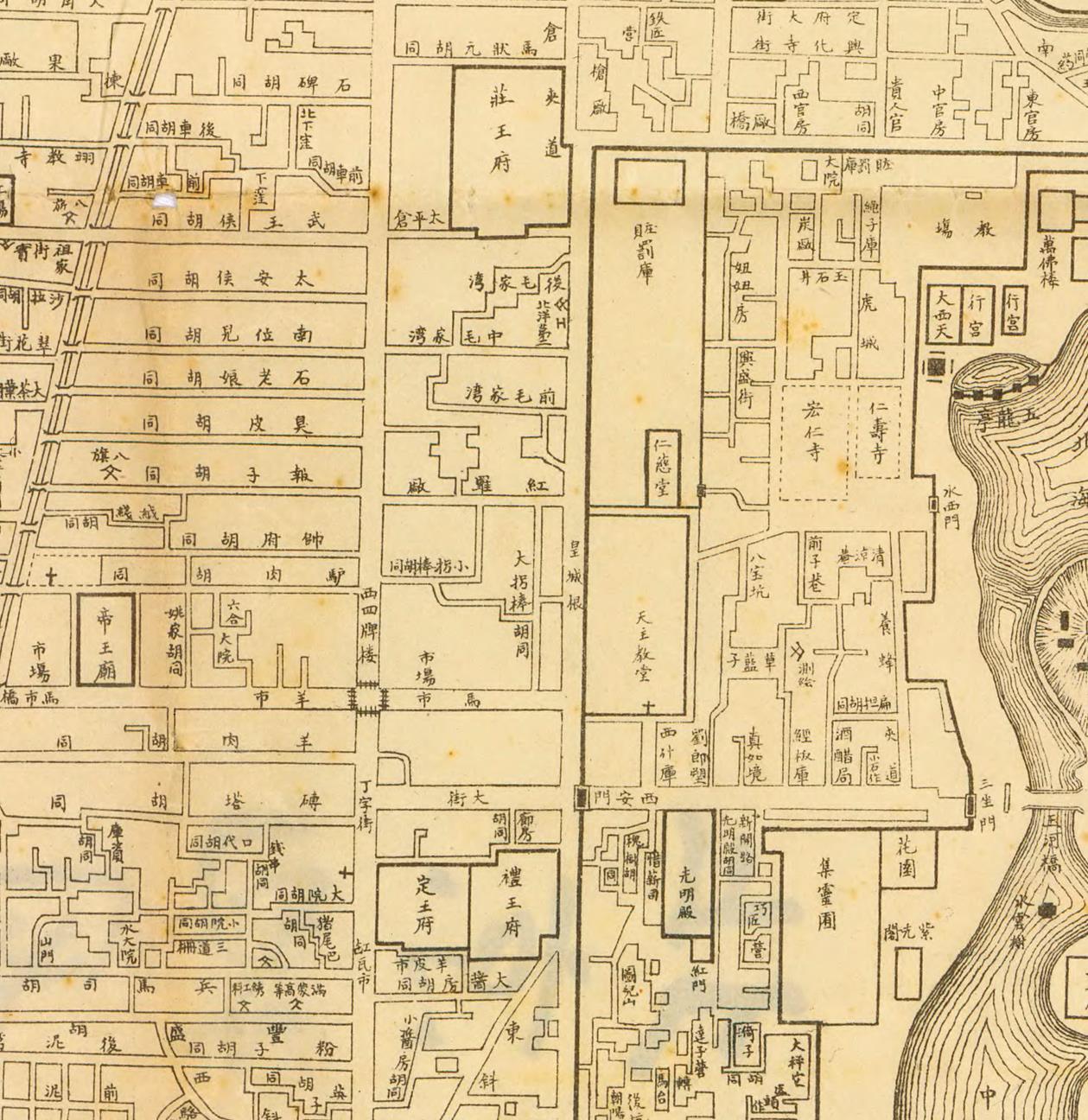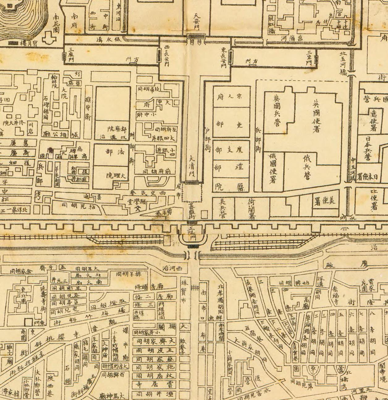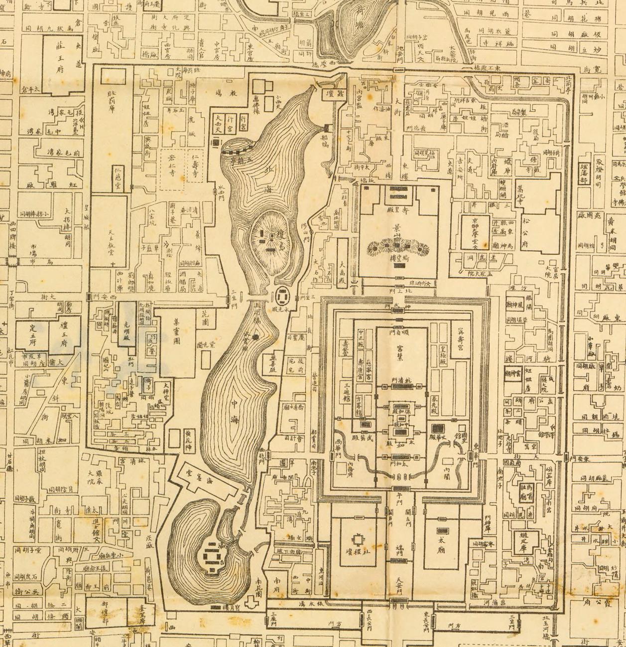 清末北京皇宫及其周边老地图。这是1908年的北京地图。北京老地图是中国所有城市老地图中,街巷最为规整、密集、标注最为详细的,不愧为首都。清末皇城内部除紫禁城外,还分布着太庙、社稷坛等礼制建筑,以及军机处、内阁等核心衙署。周边区域变化显著。东交民巷在第二次鸦片战争后逐渐成为列强使馆区,出现西式建筑,脱离清廷管控;王府井、大栅栏一带则商业兴盛,既有绸缎庄、当铺等传统商铺,也开始出现洋行、照相馆等新式业态。同时,清末战乱(如义和团运动、八国联军侵华)对皇城及周边造成破坏,部分建筑损毁,街巷秩序一度混乱,传统皇家禁