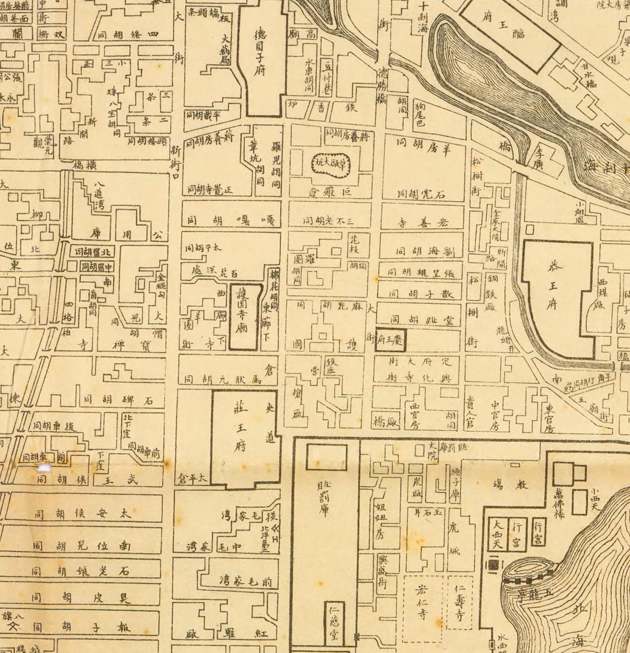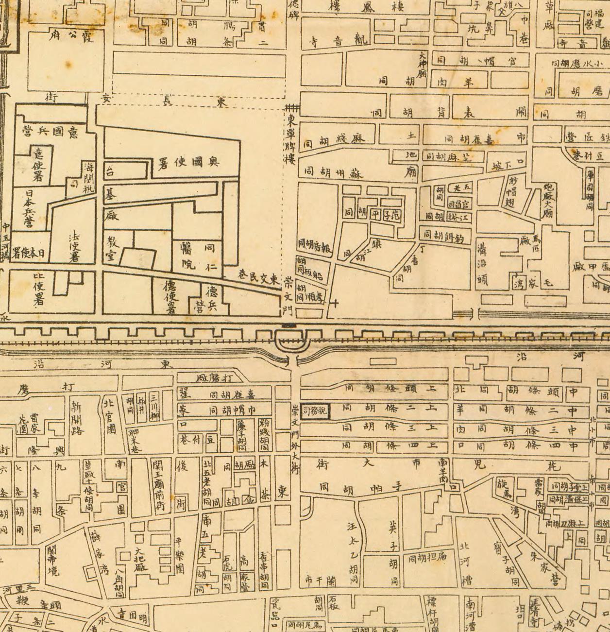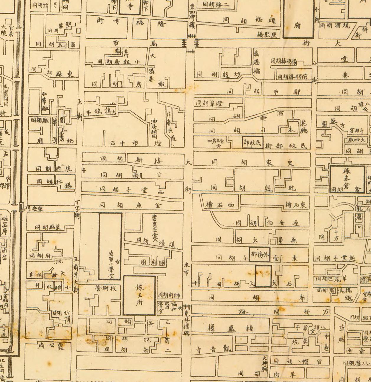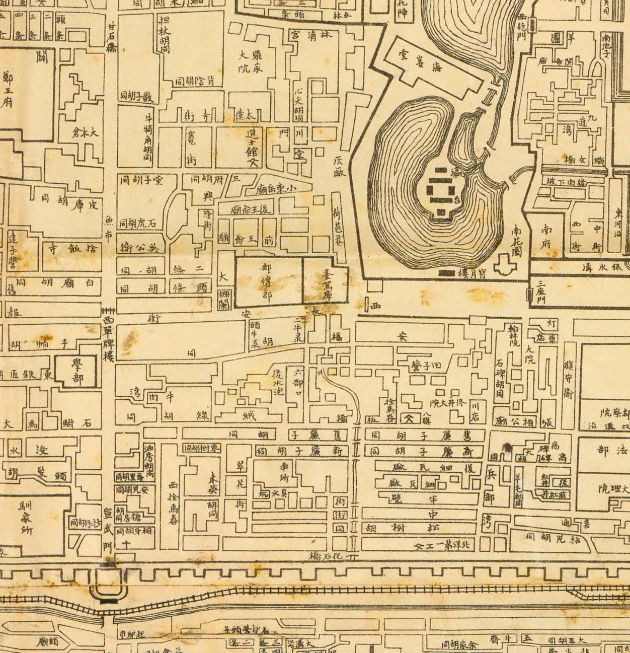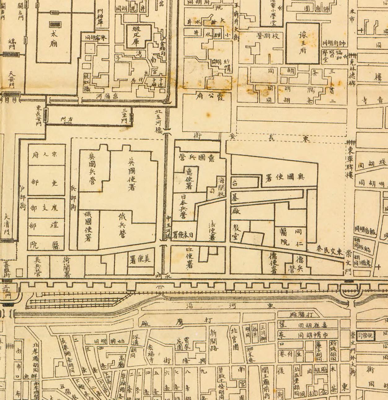 清末北京皇宫及其周边老地图。这是1908年的北京地图。北京老地图是中国所有城市老地图中,街巷最为规整、密集、标注最为详细的,不愧为首都。清末皇城内部除紫禁城外,还分布着太庙、社稷坛等礼制建筑,以及军机处、内阁等核心衙署。周边区域变化显著。东交民巷在第二次鸦片战争后逐渐成为列强使馆区,出现西式建筑,脱离清廷管控;王府井、大栅栏一带则商业兴盛,既有绸缎庄、当铺等传统商铺,也开始出现洋行、照相馆等新式业态。同时,清末战乱(如义和团运动、八国联军侵华)对皇城及周边造成破坏,部分建筑损毁,街巷秩序一度混乱,传统皇家禁
