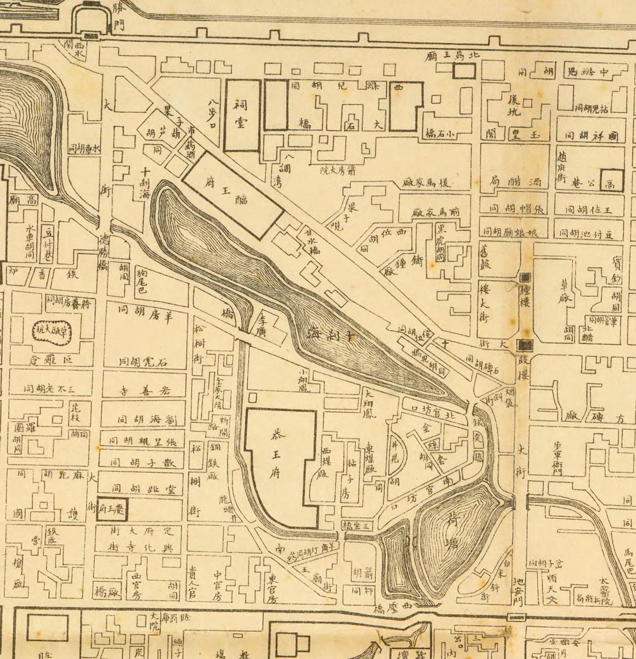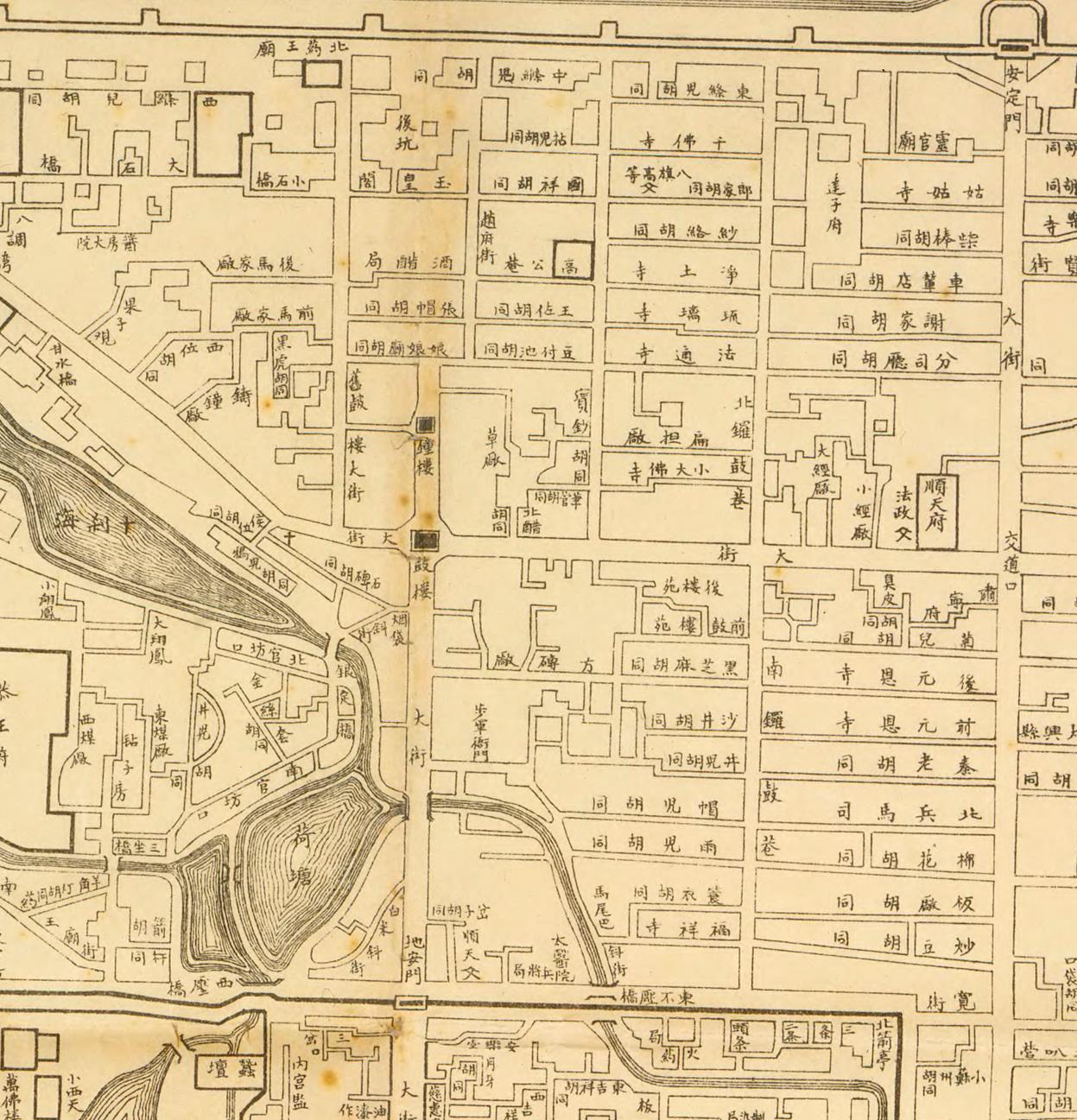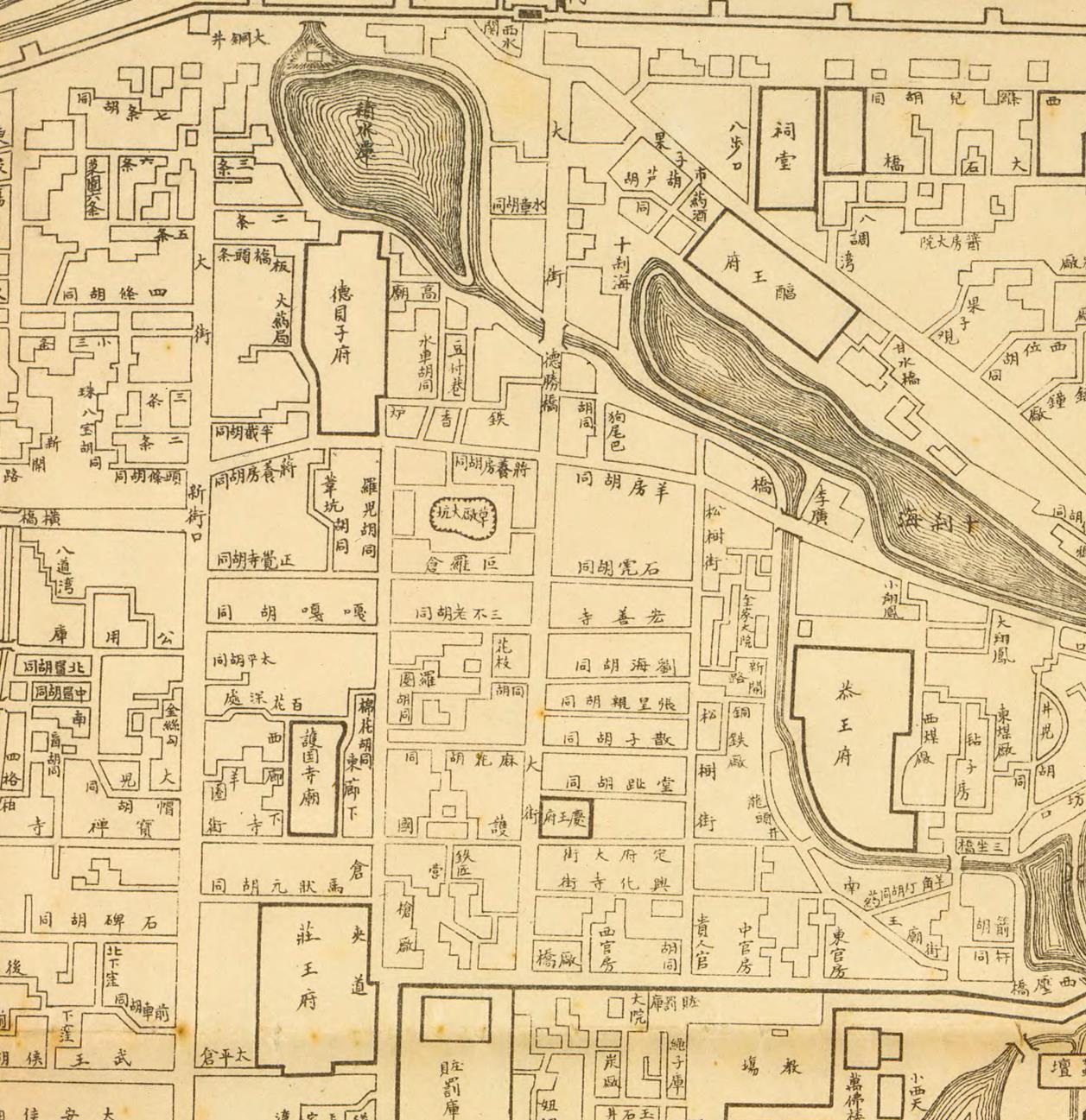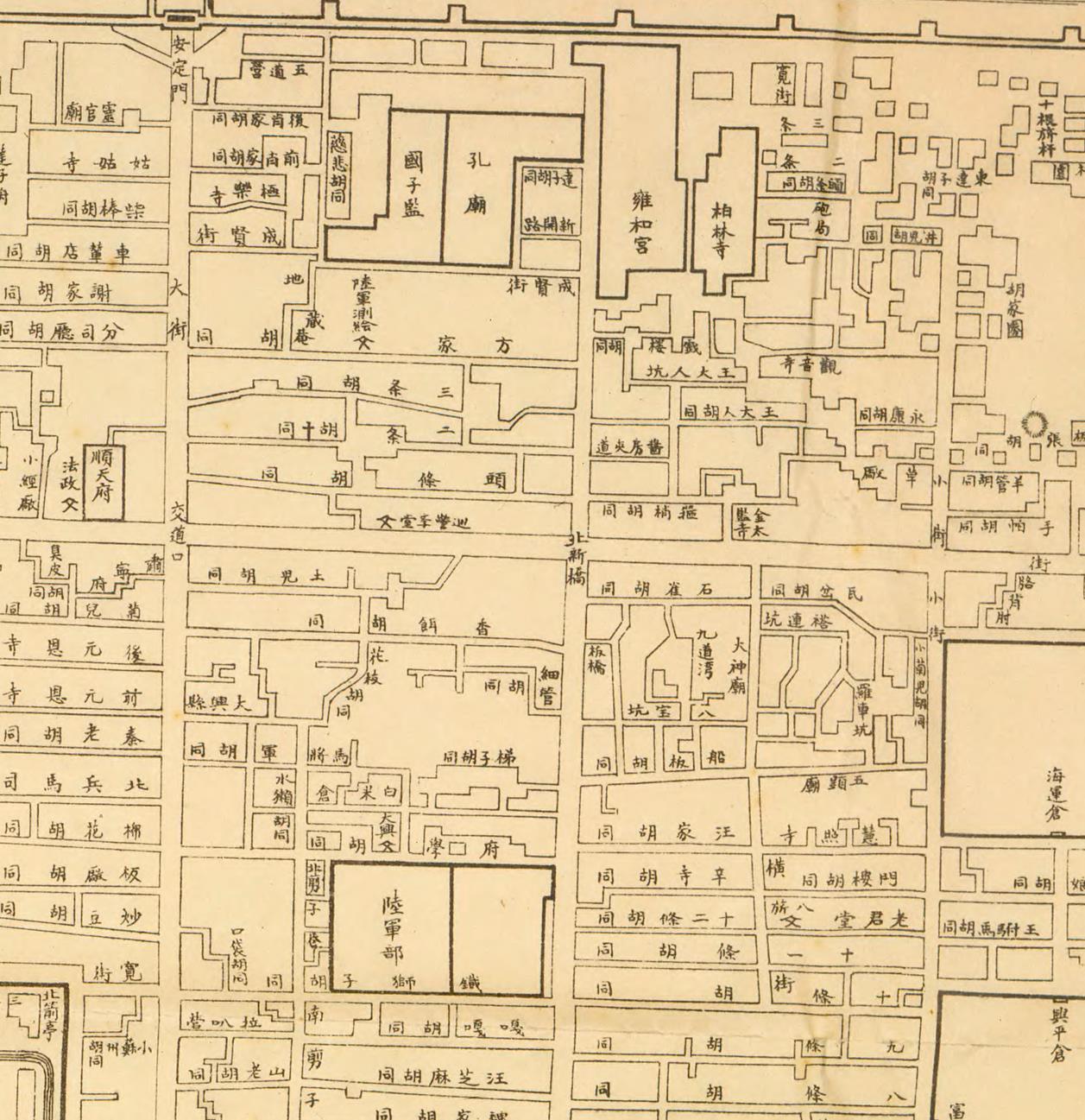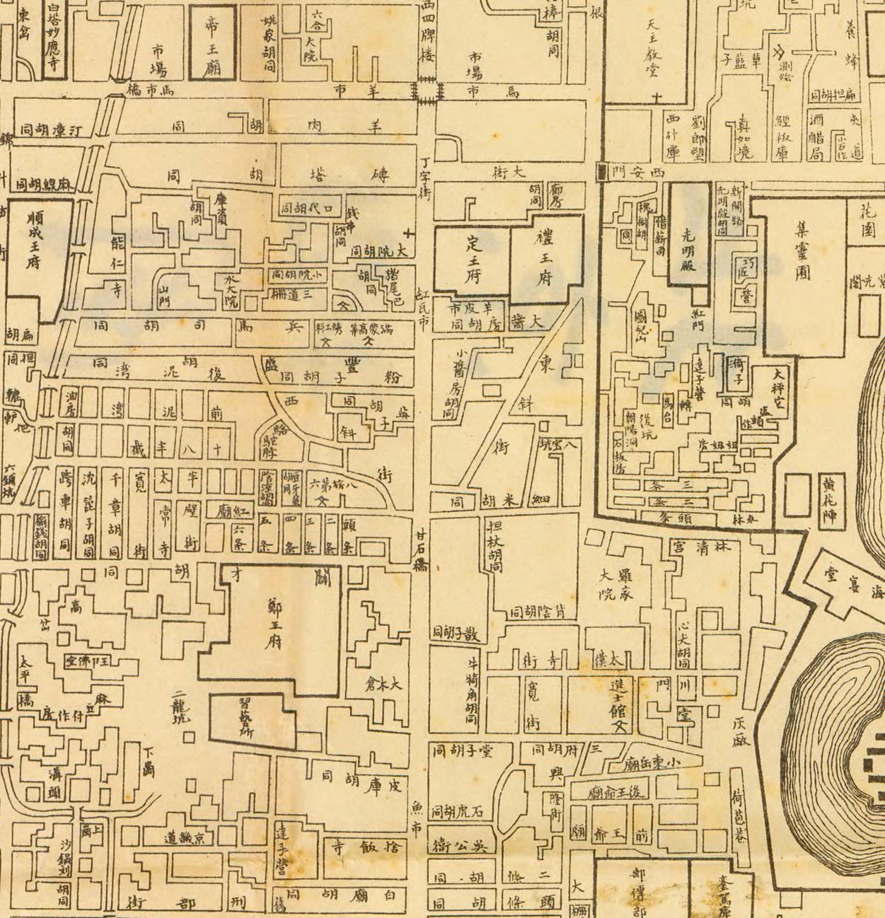 清末北京皇宫及其周边老地图。这是1908年的北京地图。北京老地图是中国所有城市老地图中,街巷最为规整、密集、标注最为详细的,不愧为首都。清末皇城内部除紫禁城外,还分布着太庙、社稷坛等礼制建筑,以及军机处、内阁等核心衙署。周边区域变化显著。东交民巷在第二次鸦片战争后逐渐成为列强使馆区,出现西式建筑,脱离清廷管控;王府井、大栅栏一带则商业兴盛,既有绸缎庄、当铺等传统商铺,也开始出现洋行、照相馆等新式业态。同时,清末战乱(如义和团运动、八国联军侵华)对皇城及周边造成破坏,部分建筑损毁,街巷秩序一度混乱,传统皇家禁