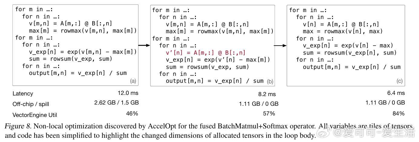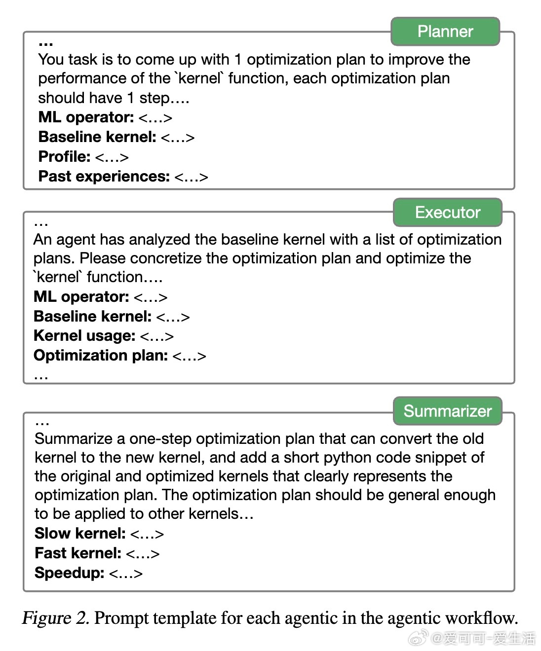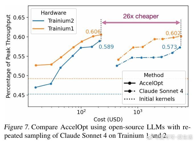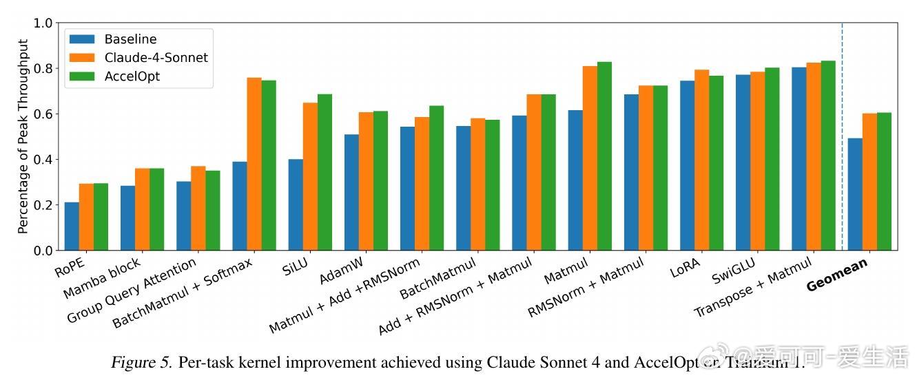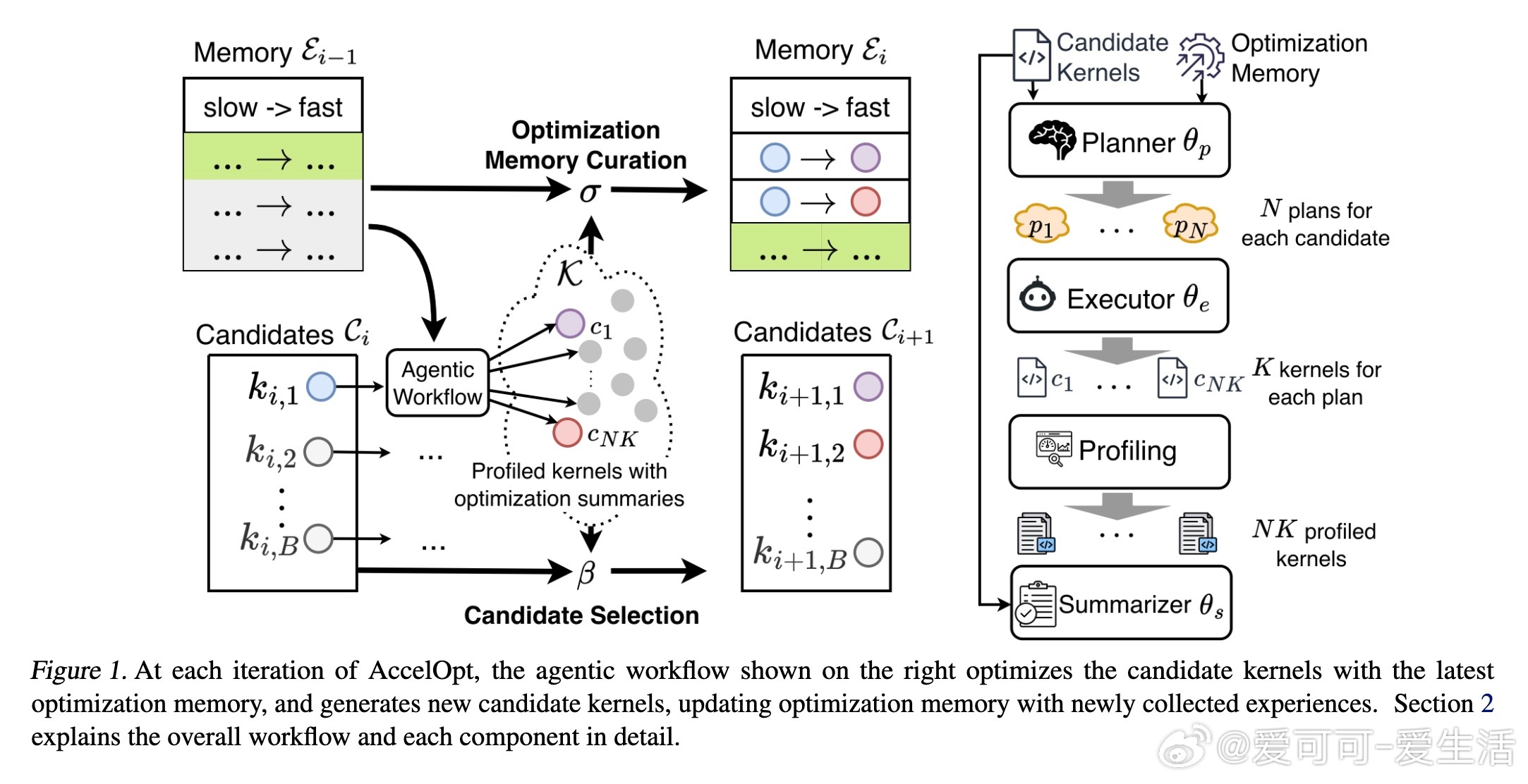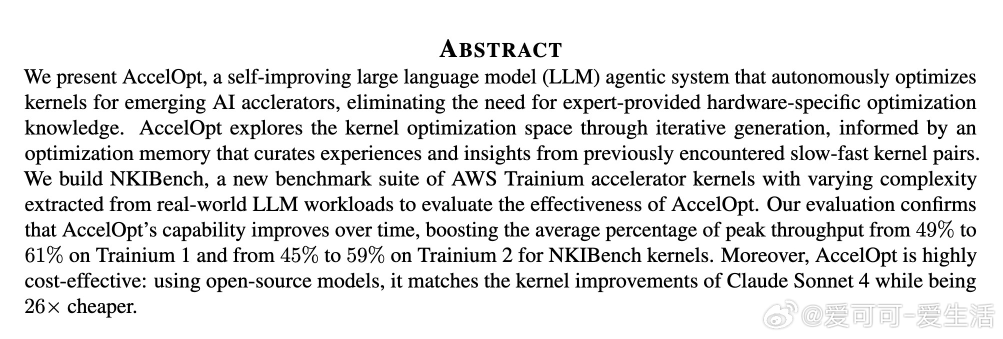[LG]《AccelOpt: A Self-Improving LLM Agentic System for AI Accelerator Kernel Optimization》G Zhang, S Zhu, A Wei, Z Song... [Stanford University & Amazon Web Services] (2025) AccelOpt:开拓AI加速器内核优化的自我进化大语言模型系统在大模型时代,AI加速器性能瓶颈愈发依赖于内核效率。优化这些底层内核代码极其复杂,尤其是新兴加速器如AWS Trainium,缺乏成熟的硬件知识和优化经验。针对这一挑战,AccelOpt提出了一种全新的自动化解决方案:1. 自我进化设计:AccelOpt构建在大语言模型(LLM)之上,结合beam search搜索策略和“优化记忆”,通过反复生成、评估和总结,逐步积累优化经验,无需专家先验知识。2. 代理工作流:系统包括规划者、执行者和总结者三个智能代理,模拟人类专家的优化思路——先分析性能瓶颈,制定优化方案,修改内核代码,性能验证后提炼总结优化策略。3. 优化记忆机制:保存历史成功与失败的优化案例(慢内核与快内核对比),为未来迭代提供经验启发,提升搜索效率和结果质量。4. NKIBench基准套件:专为Trainium设计,涵盖14个来自真实LLM工作负载的内核任务,且引入理论峰值性能指标,帮助评估优化结果在硬件潜力中的位置,而非仅对比基线速度。5. 优异表现与成本优势:在Trainium 1上,AccelOpt将平均峰值利用率从49%提升至61%;Trainium 2从45%提升至59%,表现媲美Claude Sonnet 4专业模型,同时成本降低约26倍。开源模型配合优化记忆展现良好的性价比。6. 关键技术验证:实验证明beam search比简单重复采样更有效,优化记忆提升了成本效率,且AccelOpt能自动发现从局部代数简化到多层循环变换的复杂优化。7. 限制与未来方向:部分任务性能达峰值后优化趋于饱和,部分因内核复杂度高或DSL表达限制,展现了自动优化的边界;未来可聚焦更强执行者模型和更丰富的优化空间表达。AccelOpt的出现标志着AI加速器内核优化迈入自动化、自我进化的新阶段。它不仅为新硬件平台提供了强大工具,也为教育和研究带来启发,促进了高性能计算与机器学习的深度融合。详见论文:arxiv.org/abs/2511.15915
