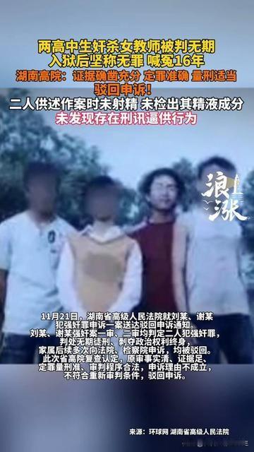 16年喊冤没停,咋湖南高院还是拍板没冤? 俩高中生奸杀女老师被判无期,一直说自己没干,可高院通报里把没检出精液说透了,他俩自己供了作案时没射精,现场脚印、目击者证言全对上了,证据链压根没断。 有人说“没精液就是没作案”,也有人说“断案哪能只看这一样?”,还有人说“16年喊冤要是真有问题,早翻案了”。 咱普通人可能觉得没精液=没干,可法律讲的是全套证据啊!受害者是个老师,她家人等了16年的真相,难道不比喊冤更疼? 你觉得没精液是无罪漏洞,还是作案里的小细节?