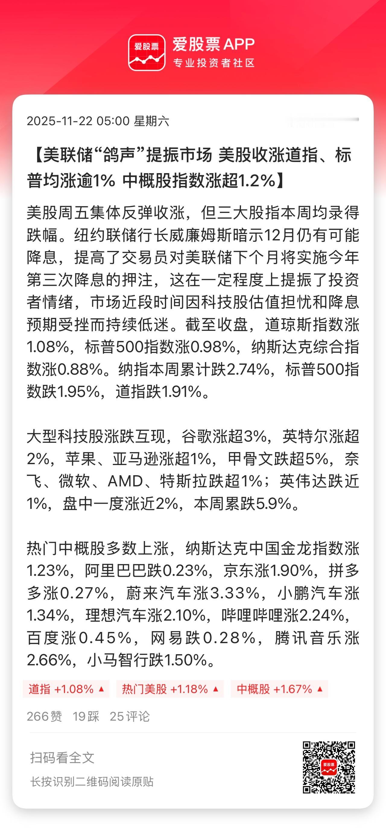 昨晚美股尾盘又跳水了,但好歹是大涨的!中概股、A50也大涨。 美联储说12月仍可能降息,这句话就像渣男说我还是爱你的!但美国投资者选择了相信。 我们A股投资者,你们还相信慢牛吗?相信的话下周该反弹了。