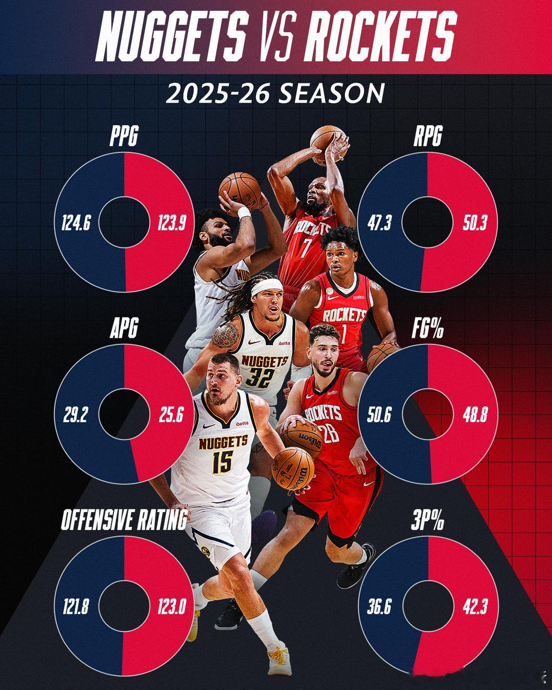 火箭掘金各项数据对比:火箭篮板/进攻效率/三分占优,掘金助攻/得分/命中率占优。