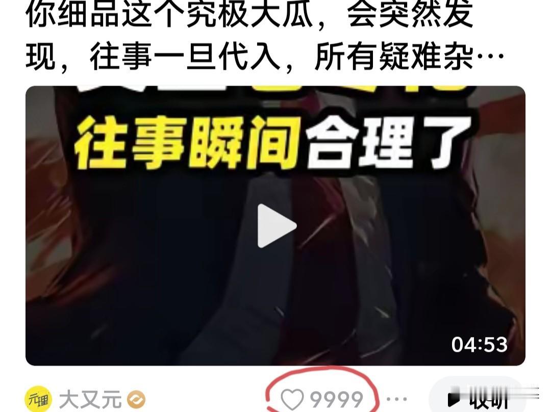 点开头条,刷到一篇视频作品(如下图)。无意间被其下面的点赞数字给晃了一下眼睛——9999! 这个数字也太特别了吧,我心里由衷地感叹,同时不由自主地给他点下了一个赞。这时的点赞数瞬间从9999变成了1万,自然而然地九九归一,真是太完美了! 平时,我是不会这样去给别人的作品点赞的,都是刷到感兴趣的便先点开作品,观看或阅读以后,觉得作品好,内容打动了自己才真心实意点上一个赞,亦或有所感触再发表一下评论。 今天刷到的这个作品,我竟然没有先点开看内容就冒然先送上了一个赞,确实是被9999这个数字给吸引的。 平时,我经常会遇到这种类似巧合的数字。比如看时间时,常常无意地为看见手机屏幕上显示的00:00、11:11和22:22这几个数字而惊讶,这种情况也是数以十计,你说这是不是很巧啊? 生活中真的有许多的巧合,反正我对这个特别敏感,因此,遇到这个9999个赞的作品,我才会不由自主先送上一个赞,就想让他九九归一,返璞归真。而且我内心也感觉到了庆幸——能为这个作品献上一个万里挑一的赞!