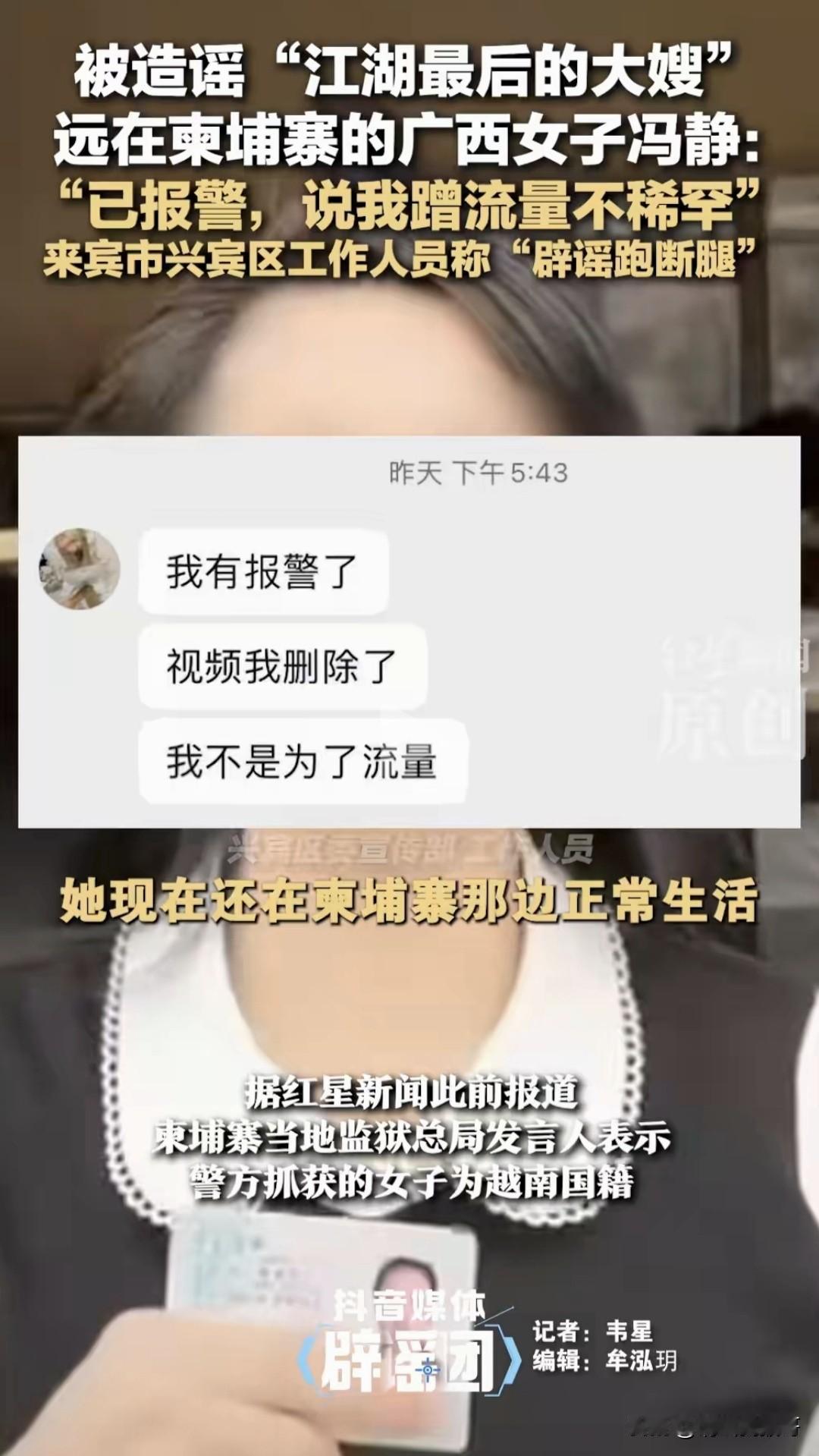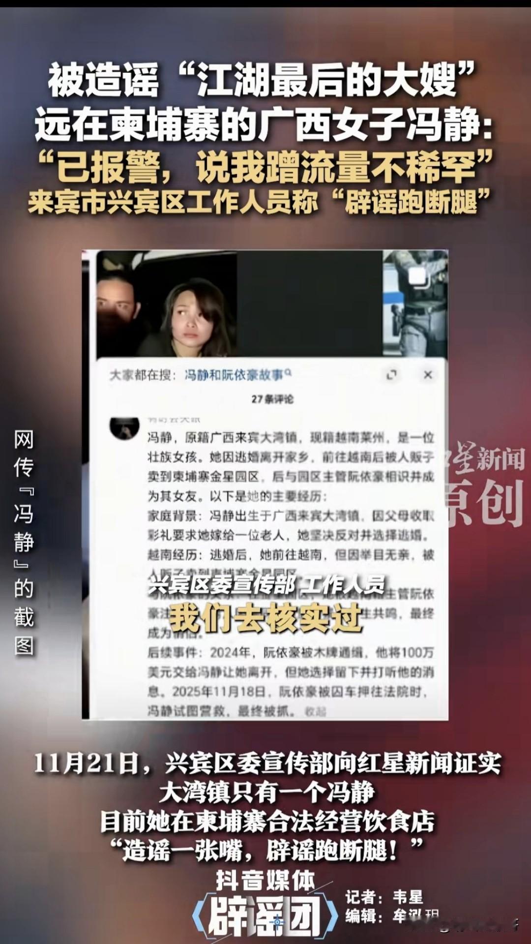 辟谣了!!! 网传的“江湖大嫂”不叫冯静,11月18日柬埔寨劫囚案后,高颜值的越南籍劫囚女子引发关注。部分自媒体编造“江湖最后的大嫂”故事,称女子叫冯静,是广西来宾兴宾区大湾镇壮族人,还虚构逃婚、劫囚情节。 11月19日,身在柬埔寨合法经营的真冯静发视频澄清,已报警处理。可即便如此,她仍遭网友质疑。实际上,劫囚女子是犯罪团伙头目之一,和囚犯们涉嫌网络赌博、诈骗、毒品等罪。网友别再被不实信息误导啦,得尊重事实。