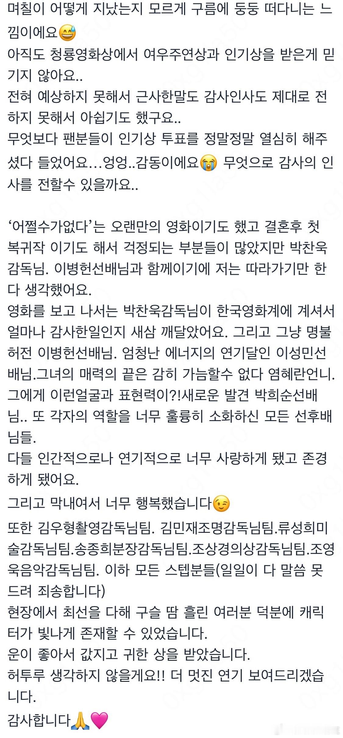 孙艺珍更新ig发表青龙奖最佳女主角获奖感言不知不觉间几天过去了,感觉就像漂浮在云端般不真实😅到现在还不敢相信自己能在青龙电影节获得最佳女主角奖和人气奖..因为完全没预料到,都没能好好表达感言和感谢之情,感到有些遗憾...最重要的是听说粉丝们真的非常努力的进行了人气奖投票…呜呜…太感动了😭 我该用什么方式来传达这份感谢呢..《无可奈何》既是我时隔许久拍摄的电影,也是婚后首部复出作品,原本有很多担心之处。但想到能与朴赞郁导演、李炳宪前辈合作,我觉得只要跟着他们走就好。看完电影后,我重新认识到朴赞郁导演能在韩国影坛是多么值得感激的事。还有名不虚传的李秉宪前辈,拥有惊人能量的演技达人李星民前辈,魅力尽头无法估量的廉惠兰姐姐。原来他还有这样的面孔和表现力?!新发现的朴熙顺前辈..以及完美消化各自角色的所有前辈后辈们。不论是人品还是演技,都让我非常热爱和尊敬。而且作为忙内真的很幸福😉还有金宇亨摄影导演团队,金敏载灯光导演团队,柳成希美术导演团队,宋宗姬化妆导演团队,赵尚敬服装导演团队,赵英旭音乐导演团队。以及所有工作人员(未能一一提及十分抱歉)。多亏各位在片场全力以赴挥洒汗水,角色才能绽放光芒。我很幸运能获得如此珍贵的大奖。我绝不会虚待这份荣誉!!必将展现更帅气的演技。感谢大家🙏🩷