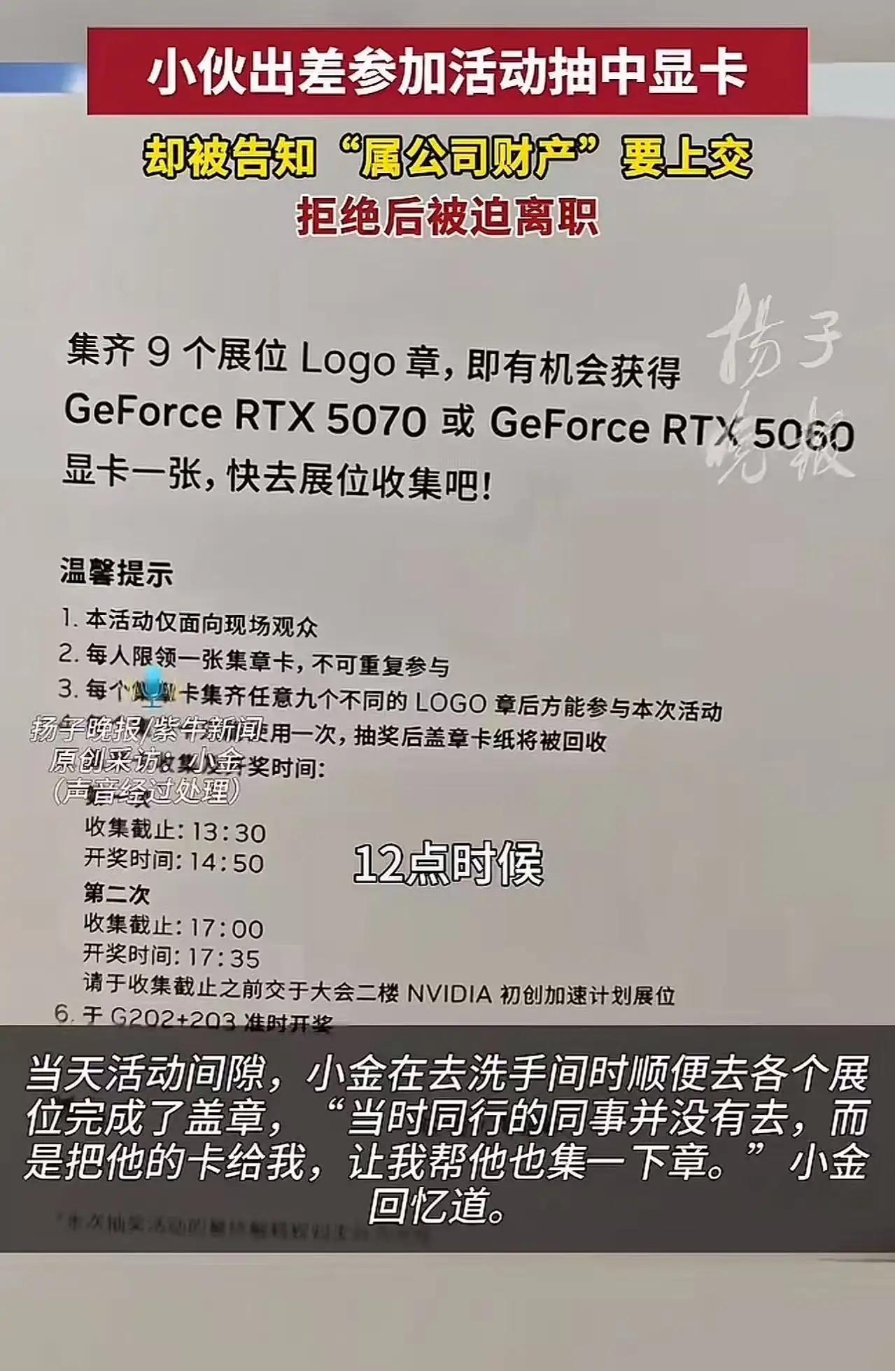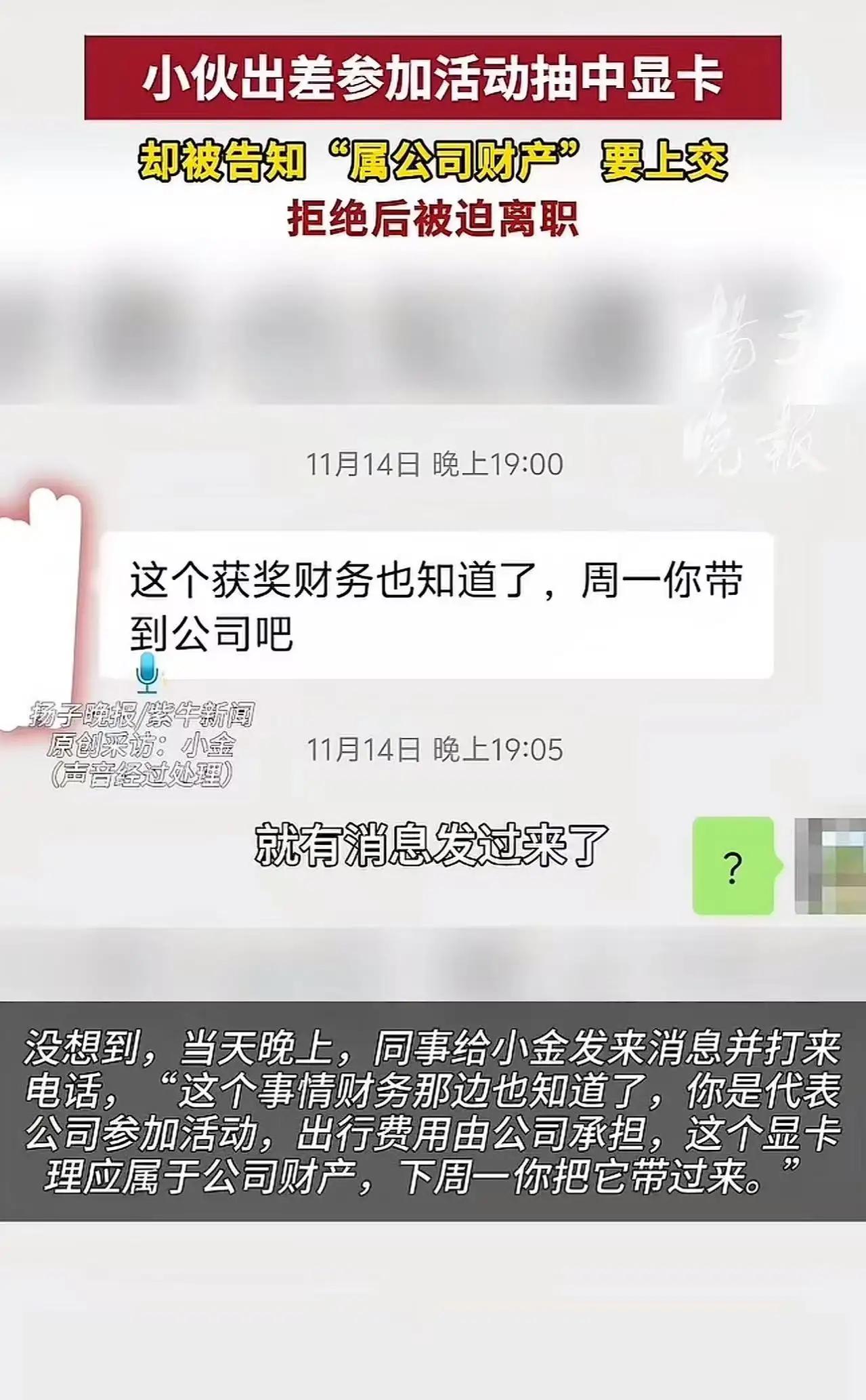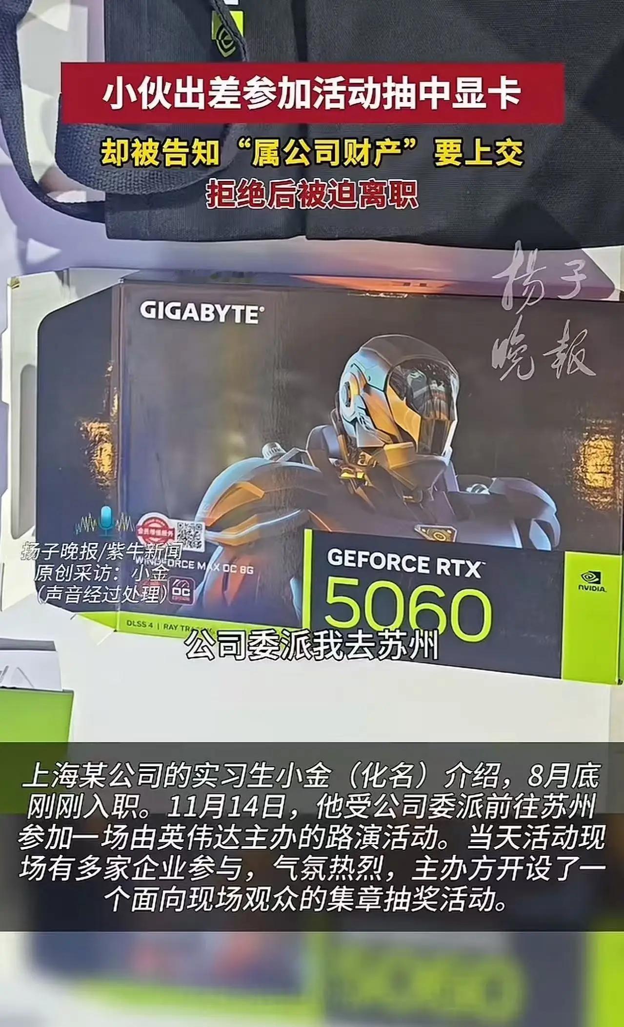 “这公司丢脸丢大了!”上海icon,小伙出差参加展会活动,运气爆棚抽中了一张价值3000元的显卡icon。可万万没想到,公司却告知他这“属于公司财产”,要求他上交。小伙自然是不同意,拒绝上交后竟被迫离职了。网友:离职就对了,这种离了一张卡都活不起的公司,干着没前途! 小金是某公司的实习生,8月底刚入职。11月14日,他受公司委派,前往苏州icon参加一场由英伟达icon主办的路演活动。 活动当天,主办方为现场观众设置了集章抽奖活动。小金趁着活动间隙去洗手间的时候,顺便到各个展位完成了盖章。同行的同事没去集章,把自己的集章卡交给小金,让他帮忙盖章。 令人意想不到的是,小金运气好到爆,竟然抽中了一张价值约3000元的5060显卡,而同事却没中奖。 这可是小金人生中中的第一个大奖,他当时别提多高兴了。然而,当天晚上,同事就给小金发消息还打电话说:“财务那边知道你中奖的事儿了。你是代表公司去参加活动的,出行费用都是公司承担的,这显卡理应归公司所有,下周一你把它带到公司来。” 然而,小金的心里却升起了一股难以抑制的愤怒。这不仅仅是一张“幸运”的显卡,更像是一场对他个人权益的无声控诉。难道在这个公司里,员工的每一次好运、每一份努力,都要被“归属”成公司财产?这真是让人难以接受的逻辑。 小金坚决拒绝了公司的要求,他觉得自己出差的目的,是完成任务、学习成长,而不是成为公司“财产”转让的对象。更何况,这张显卡完全是活动主办方的赠礼,属于个人的幸运,不应被公司随意剥夺。可公司却似乎认定,员工的每一份“幸运果实”都应归公司所有,否则就意味着“背叛”。 这场“权利与义务”的拉锯战,让小金意识到:在某些企业文化里,员工的权益似乎从未被真正尊重过。公司用“归属”来绑架员工,把个人的幸福和努力变成“公司资产”,这不仅是对个人的剥夺,更是一种对员工尊严的践踏。 更令人心寒的是,小金的坚守并没有得到应有的理解,反而迎来的是“辞退”的威胁。公司以“公司利益”为由,试图剥夺他的合法权益。面对这样的“霸王条款”,他选择了坚决反抗,毅然辞职,用行动告诉所有人:员工不是任人驱使的工具。 这件事引发了网络热议。有人说:“这样的公司,离职就对了。没有尊重的企业,怎么能谈未来?”也有人感慨:“职场里,除了拼业绩,还要学会捍卫自己的权益。”更有人指出:“这不仅仅是一个显卡的故事,而是职场公平与尊重的缩影。” 其实,职场中的“公平”从来都不是天上掉下来的恩赐,而是每个员工用坚持和勇气争取而来的。我们要相信,真正的正能量企业,是懂得尊重每一位员工的付出和幸运的。而那些试图用“归属”绑架员工的公司,终究会被时代淘汰。 最后,希望每一位职场人都能明白:你的每一次努力、每一份幸运,都值得被尊重。不要让任何公司用“财产归属”来剥夺你的权益。勇敢站出来,为自己争取应得的尊重和权益,才是真正的职场赢家。头号周刊