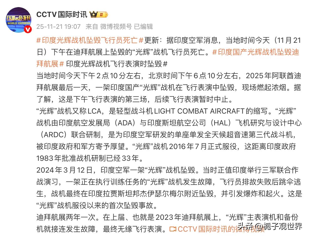 今年印度空军很悲催,在印巴5·7空战中,巴方飞行员驾驶中式歼-10c战机,击落5架印度战机,分别为3架法式阵风、1架俄式米格和1架苏-30,印度在此次空战中损失惨重。印度这些年大量的进口法国和俄罗斯的战机、以及先进的空空导弹,自认为军事实力排世界前列,永远超过了巴基斯坦的实力,没想到印巴这一战彻底的打击了印度空军的自信心。 21日,是2025年阿联酋迪拜航展最后一天,一架印度国产“光辉”战机在飞行表演中坠毁,造成飞行员死亡。印度本来是雄心勃勃,要自己生产战机,“光辉”战机就是由印度航空发展局组织研制生产,印度可能是想借这次航展向世界展示一下印度强大的科研和生产能力,结果又搞砸了。现在看来,印度如果想要造出更加先进的隐形战机,那真是猴年马月的事。