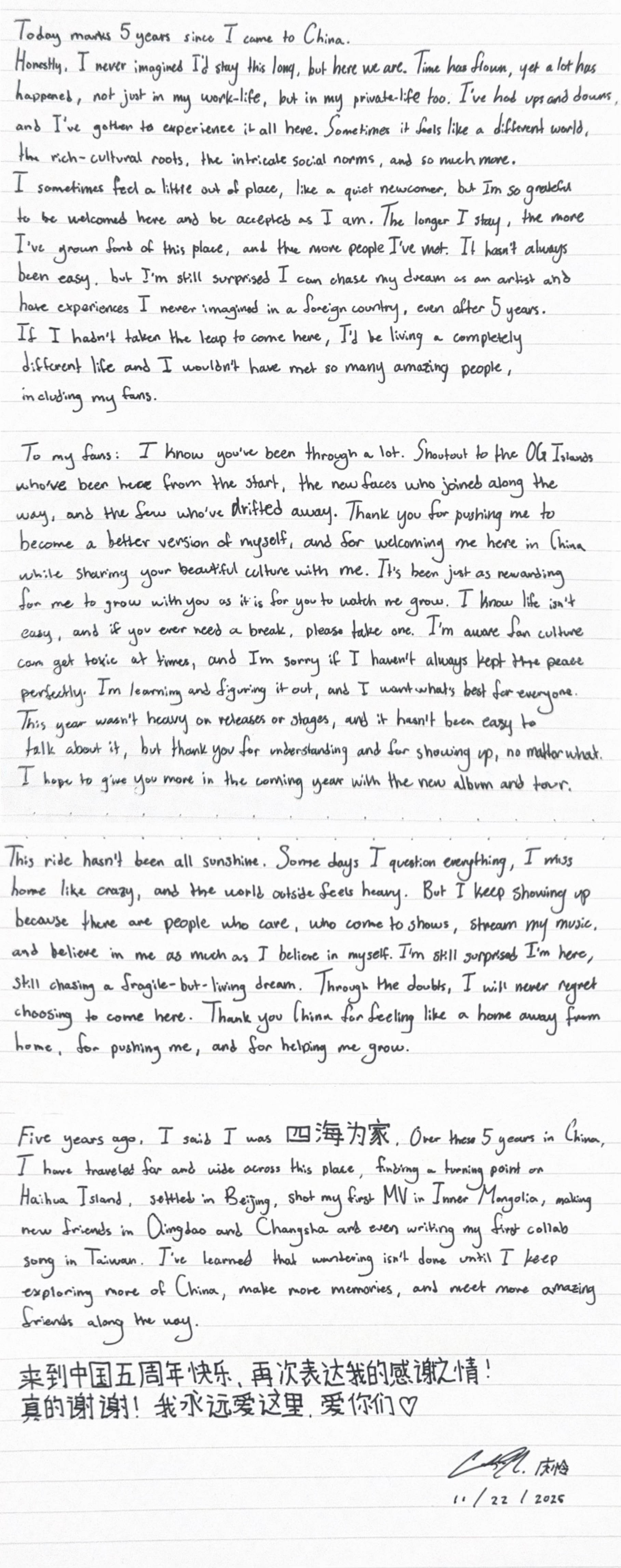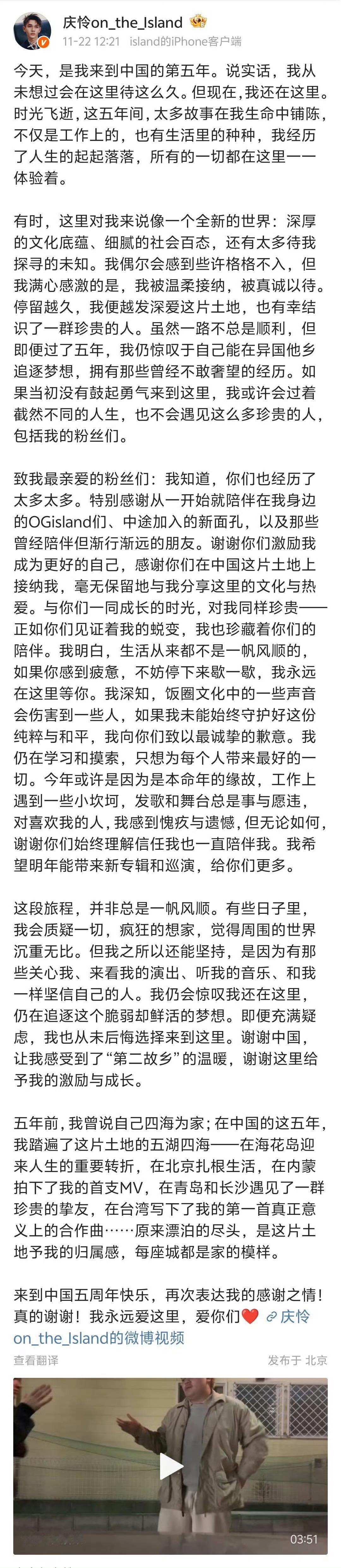 好快啊都五年了。。那个海花岛相见的日子到现在庆怜已经在这片土地生活了五年了😭感性的小老外也写了大长文 很真诚的文字吧!“停留越久,我便越发深爱这片土地,也有幸结识了一群珍贵的人。过了五年,我仍惊叹于自己能在异国他乡追逐梦想,拥有那些曾经不敢奢望的经历。”“来到中国五周年快乐,再次表达我的感谢之情!真的谢谢!我永远爱这里,爱你们”好真诚勇敢的庆怜崽 支持闯中态度都要这样好吗!✊
