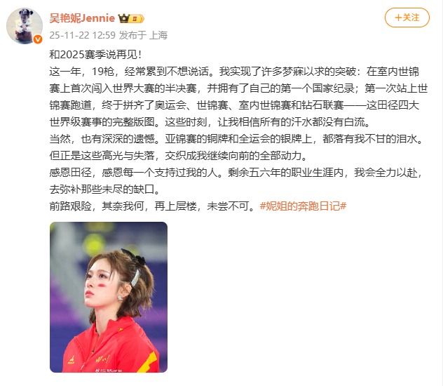 【吴艳妮发文和2025赛季说再见】 和2025赛季说再见!这一年,19枪,经常累到不想说话。我实现了许多梦寐以求的突破:在室内世锦赛上首次闯入世界大赛的半决赛,并拥有了自己的第一个国家纪录;第一次站上世锦赛跑道,终于拼齐了奥运会、世锦赛、室内世锦赛和钻石联赛——这田径四大世界级赛事的完整版图。这些时刻,让我相信所有的汗水都没有白流。当然,也有深深的遗憾。亚锦赛的铜牌和全运会的银牌上,都落有我不甘的泪水。但正是这些高光与失落,交织成我继续向前的全部动力。感恩田径,感恩每一个支持过我的人。剩余五六年的职业生涯内,我会全力以赴,去弥补那些未尽的缺口。前路艰险,其奈我何,再上层楼,未尝不可。