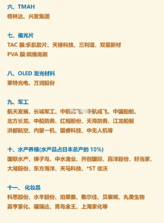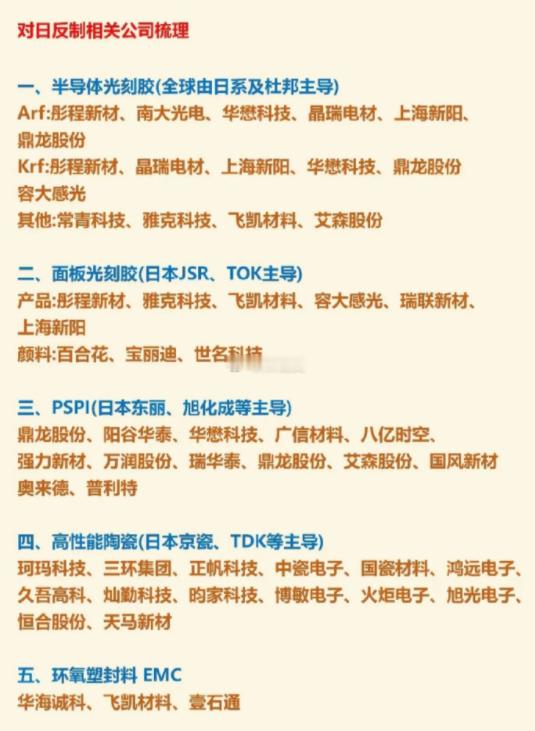 最新:对日反制相关公司梳理(全)!总计涉及11个板块:附核心龙头股一、半导体光刻胶(由日系及杜邦主导)二、面板光刻胶(日本JSR、TOK主导)三、PSPI(日本东丽、旭化成等主导)四、高性能陶瓷(日本京瓷、TDK等主导)五、环氧塑封料EMC六、TMAH七、偏光片八、OLED发光材料九、军工十、水产养殖(水产品占日本总产的10%)十一、化妆品