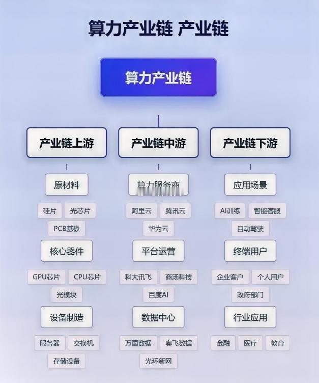 算力全产业链梳理!上游是基础设施支撑,提供PCB基板、GPU芯片、服务器等硬件;中游是算力服务与运营,负责算力输出与部署;下游是场景与用户,覆盖AI训练、自动驾驶及金融等行业,是AI、数字化产业的基础支撑链条。受益个股梳理1. $沪电股份 sz002463$ :属算力上游原材料环节,主营PCB基板,是算力设备的核心载体材料供应商,产品适配服务器等硬件需求,在高端PCB领域市占率较高,是算力基础设施材料端的核心受益企业。2. $生益科技 sh600183$ :布局算力上游PCB材料,是国内覆铜板龙头,其产品为算力设备的PCB基板提供核心原料,适配服务器、交换机的制造需求,是算力产业链原材料环节的重点受益标的。3. $寒武纪 sh688256$ :聚焦算力上游核心器件的GPU芯片领域,是国内AI芯片龙头,其智能芯片可支撑算力基础设施的AI运算需求,在国产GPU替代进程中,是核心器件环节的关键受益企业。4. 景嘉微:参与算力上游核心器件的GPU芯片布局,是国内军用GPU龙头,同时拓展民用算力芯片领域,其GPU产品适配部分算力硬件的运算需求,是核心器件环节的受益标的之一。5. 中际旭创:属算力上游核心器件的光模块领域,是全球光模块龙头,高速光模块为算力设备间数据传输提供支撑,适配数据中心、服务器的高带宽需求,是核心器件环节的核心受益企业。6. 新易盛:布局算力上游光模块环节,专注高速光模块研发,产品支撑算力设备数据传输,适配数据中心、服务器的带宽需求,在全球光模块市场占比靠前,是该环节的重点受益标的。7. 中科曙光:聚焦算力上游设备制造的服务器领域,是国内服务器龙头,算力服务器为数据中心、AI训练提供硬件支撑,在国产算力设备替代中地位突出,是设备制造环节的核心受益企业。8. 浪潮信息:属算力上游设备制造的服务器领域,是全球服务器龙头之一,产品覆盖通用及AI算力服务器,支撑数据中心、算力集群的硬件需求,是设备制造环节的重点受益标的。9. 紫光股份:布局算力上游设备制造的交换机领域,是国内ICT设备龙头,交换机为算力集群提供网络连接支撑,适配数据中心、服务器的组网需求,是设备制造环节的受益企业。10. 阿里巴巴:对应中游算力服务商的阿里云,是国内云计算龙头,阿里云提供算力租赁、云服务,覆盖AI训练、企业数字化等需求,是中游算力服务环节的核心受益主体。11. 腾讯控股:参与中游算力服务商的腾讯云布局,是国内云计算头部企业,腾讯云提供算力基础设施服务,支撑AI、企业数字化等场景需求,是中游算力服务环节的重点受益标的。12. 科大讯飞:属中游平台运营环节,是国内智能语音龙头,其AI平台为算力下游应用提供技术支撑,适配智能客服、AI训练等场景,是中游平台运营环节的核心受益企业。13. 商汤科技:布局中游平台运营领域,是国内计算机视觉AI龙头,其AI平台支撑算力下游的视觉类应用,覆盖自动驾驶、智能安防等场景,是平台运营环节的受益标的之一。14. 万国数据:属中游数据中心环节,是国内第三方数据中心龙头,其数据中心为算力服务商提供硬件托管载体,适配云计算、AI训练的部署需求,是数据中心环节的核心受益企业。15. 奥飞数据:布局中游数据中心领域,是国内第三方数据中心企业,其数据中心为算力硬件提供托管服务,支撑云计算、企业数字化的算力部署需求,是数据中心环节的受益标的之一。16. 三六零:属下游应用场景的AI训练领域,是国内互联网安全龙头,依托算力支撑AI安全、大模型训练等应用,适配企业、个人的安全及AI需求,是下游应用环节的受益企业。17. 卫宁健康:布局下游行业应用的医疗领域,是国内医疗信息化龙头,依托算力支撑医疗数据智能化分析、智能诊疗等应用,是医疗行业算力应用环节的核心受益标的。18. 东方财富:参与下游行业应用的金融领域,是国内互联网金融龙头,依托算力支撑金融数据分析、智能投顾等应用,适配个人及企业的金融服务需求,是金融行业算力应用的受益企业。19. 德赛西威:布局下游应用场景的自动驾驶领域,是国内车载电子龙头,依托算力支撑自动驾驶的感知、决策运算需求,是自动驾驶场景算力应用的核心受益企业。20. 中科创达:参与下游自动驾驶应用场景,是国内智能汽车操作系统龙头,依托算力支撑车载智能系统的运算需求,适配自动驾驶的软件部署,是该场景的受益标的之一。总结这些家企业完整覆盖了算力产业链的上、中、下游环节——从上游的硬件材料与设备,到中游的算力服务与数据中心,再到下游的多行业应用场景,均是算力产业规模扩张进程中的直接受益主体,将随AI、数字化需求增长同步分享行业发展红利。本文涉及资讯、数据等内容来自网络公共信息,仅供参考,不构成投资建议!
