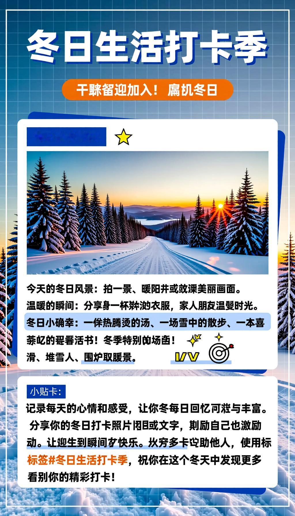 🌟 每日打卡内容建议: 今天的冬日风景:拍一张雪景、暖阳或冰冻的美丽画面。 温暖的瞬间:分享一杯热茶、暖暖的衣服或与家人朋友的温馨时光。 冬日小确幸:比如一份热腾腾的汤、一场雪中的散步或一本喜欢的书。 冬季特别活动:滑雪、堆雪人、围炉取暖的温馨场景。 🎯 小贴士: 记录每天的心情和感受,让你的冬日回忆更丰富。 分享你的冬日打卡照片或文字,激励自己也激励他人。 使用标签冬日生活打卡季,让更多人看到你的美好瞬间。 祝你在这个冬天中发现更多温暖与快乐!期待看到你的精彩打卡!