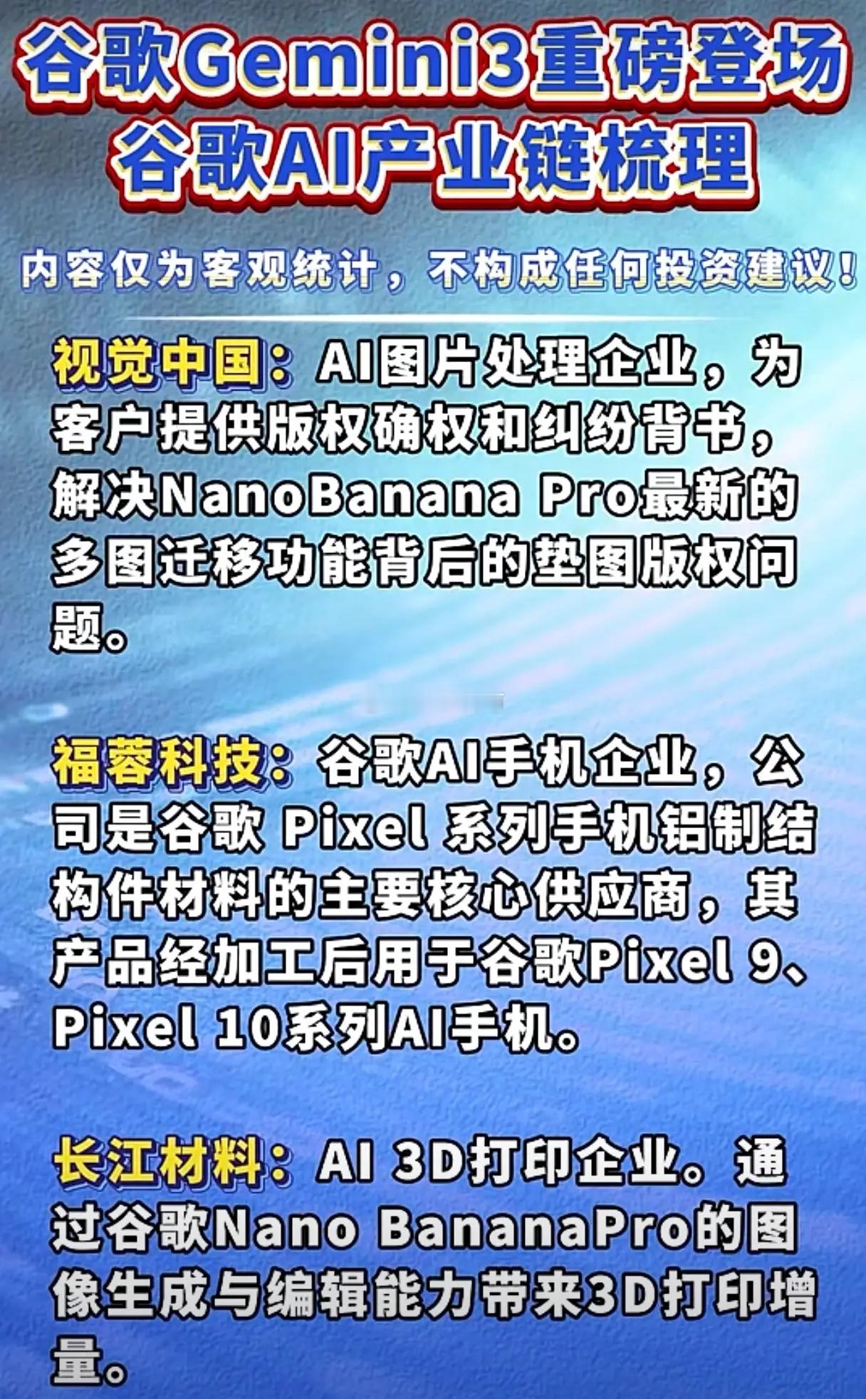 Gemini 3引爆AI产业链:中国企业凭什么成谷歌“核心队友”?当谷歌Gemini 3在11月18日以“最智能AI模型”身份登场时,中国企业已悄悄嵌入其生态的关键节点。光库科技通过收购武汉捷普,拿下谷歌TPU算力集群70%的OCS光路交换机代工份额——单台9000美元毛利、2026年4.7万台订单预期,正踩着AI算力爆发的风口;福蓉科技则把铝制结构件送进Pixel 9/10系列AI手机,成为硬件供应链的“隐形支柱”。更颠覆的是内容端:欢瑞世纪用Gemini模型简化短剧制作,荣信文化靠Nano Banana Pro实现漫画“一键上色+翻译+排版”;长江材料借该模型的3D生成能力,把个性化手办打印门槛拉到“上传照片即成品”,甚至带火了3D打印砂型铸造技术。连版权痛点都被视觉中国的SynthID水印和确权服务精准补上——这不是简单的“供应链配套”,而是中国企业从硬件代工到场景创新的全链条卡位,把AI革命变成了自己的增长引擎。
