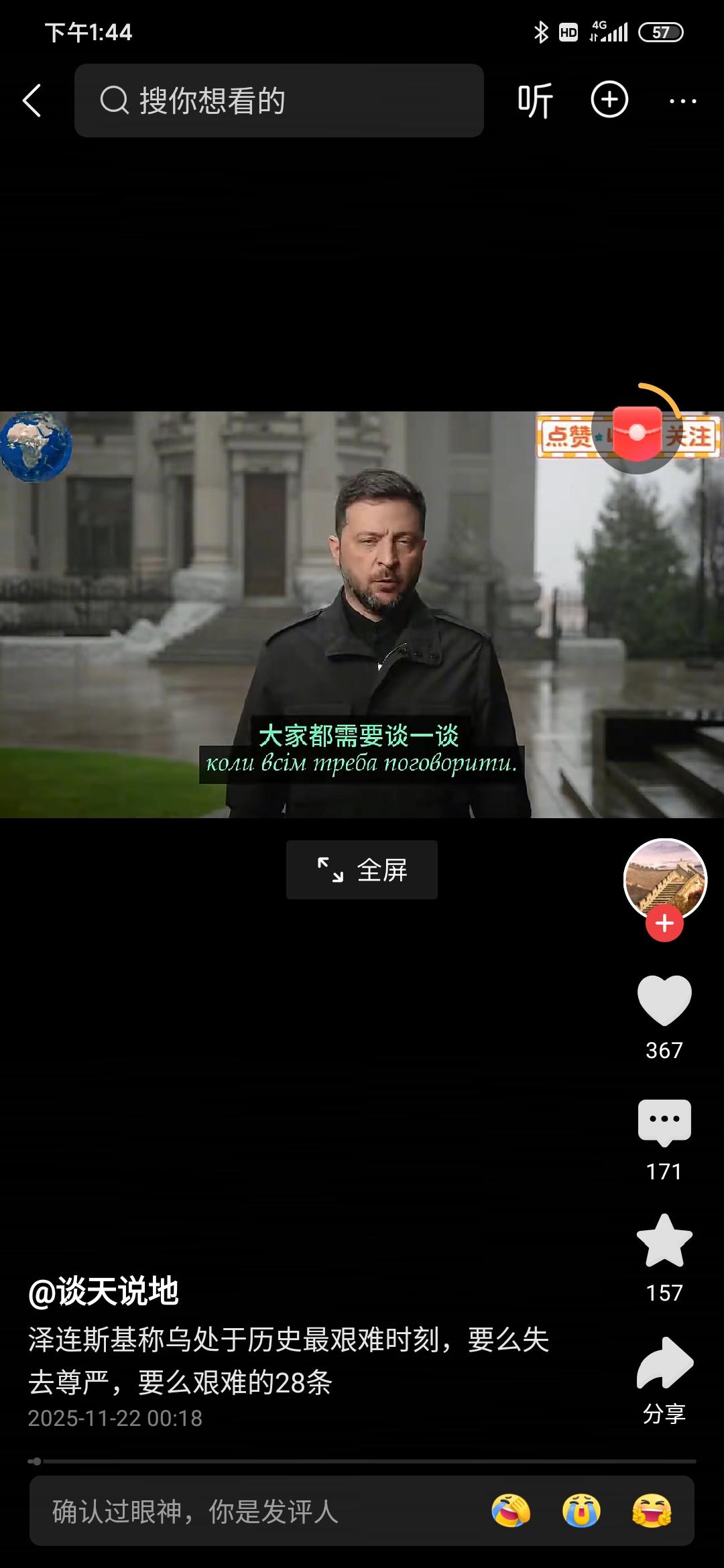泽连斯基发表全国讲话:现在是乌克兰历史上最艰难的时刻之一。此刻,我们可能面临一个极为艰难的选择:要么失去尊严,要么冒着失去关键伙伴的风险。 是接受这28条艰难条件,还是迎来一个极其严酷的冬天——最艰难的冬天,并承担进一步的风险。 现在讲话征求要求用吗,俄罗斯跟你谈判的时候怎么不问老百姓愿不愿意呢,现在不想背这锅,我不想签的,万一哪天真签了,也是你们想签,我才这样的。 在另一个平行宇宙中,乌克兰,凭借优越的地理位置,前苏联留下的工农业基础,加上肥沃的土地,丰富的矿产,适中的人口数量,强大的常规军力和核武,根本不用选边站队,最多只需要在大国之间当个墙头草,就能活的很滋润,如果他们愿意,甚至可以称霸一方,不过在我们现在这个宇宙中,他们把自己搞到要亡国