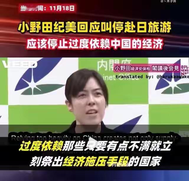 日本女大臣小野放豪言;中国太坏 一有不满就在经济上施压,不妨换个方式试试? 发言表示,日本应该停止过度依赖中国的经济! 这话说得沒毛病,想借台湾生事,在经济上别想再依赖中国的供应这就是骨气的日本? 早苗说错话又找不到适合的台阶下,日本这位经济担当女大臣,于是想替高市挽回颜面! 这让很多的右翼分子又支愣了起来,对高市的支持还是挺高的? 这个美日混血儿“对美跪舔、对华瞪眼”好话不多,错词连串,说话直接,跟早苗的性格似乎很贴近! 跟在高市身边是个好助手。 据日本机构统计,以2022年为例,日本汽车产业在全球出口的比例中,对中国出口占比就高达31%。机电数据也类似。 九成左右的汽车、半导体配件存在对中方的依赖。短时间完全切断,不现实。 日本汽车产业若失去中国市场,大量汽车将面临滞销,工厂可能减产甚至停产,无数工人会面临失业的状态。 机电产业和半导体配件行业也会遭受重创,研发和生产都会陷入困境。 供应链一旦出现危机,将影响外贸公司近27%的利润。 跟中国玩“独立游戏”更是巴不得日本这样干? 坦白地说;日本的旅游业一旦失去中国游客,这个诺大群体的贡献与支撑,那些靠旅游为生的酒店、餐饮、景点等相关产业,都将陷入萧条中而展露出行业萎靡不振的现象! 市场数据分析就摆在哪儿是更具说服力的理由。 就其日本资源匮乏这样的国情而言,无论出口还是进口,短期内都无法切割中日之间依赖这个联系的, 中国对日本而言有着“举足轻重”的地位。经济安全是完全依附咱们的! 就她日本想实现“自力更生”独挡一面,从来不是她小野通过嘴上发泄一下不满情绪而已? 告诉她小野倒过来也不妨试试,跟中方脱钩断链,日本经济将是什么样的凄惨情景? 中方能否站稳脚跟? 可即便现实数据如此清晰,这些日本政客却依旧沉浸在自己的幻想中。 作为日本的一位经济担当大臣小野,似乎根本不把这些经济账放在眼里,只知道一味地迎合某些势力,只为讨得高市的高兴,右翼势力的抬举,喊着毫无实际意义的口号。 担当到哪儿喽,真是糊涂蛋! 他们以为只要喊出“经济停止过度依赖中国”,这口号,就能轻易改变现状,这就能让日本在经济上实现所谓的“独立”? 但他们忘了,经济规律是客观存在的,不是靠几句空洞的言辞就能打破的。 这些日本政客为了一时的政治作秀,全然不顾本国企业和民众的利益。 他们与中方脱钩断链的想法,就像一场注定失败的闹剧, 最终只会让日本经济摔得头破血流。 希望他们能早日清醒,不要再做这种损人不利己的蠢事了。 不是她小野放出豪言,日本经济要减免或停止对咋中国的依赖, 中国就可以放弃对日本的还击? 咋们还不想跟日本这样不讲道义的国家,续这样的外交贸易! 不是咱们中国不满,而是她日本欺凌其它国家的野心沒填满,来生事惹下的是非。 是她日本是公开犯我,而不是我国无故犯她日本,提醒她小野要分清这个主次关系再来放言挑战? 又被小野给颠倒了说法! 日本政客将日本经济,外交,民生,政治搅在一起搞得一塌糊涂, 转过头来在咋身上撒气,咱们奋起自卫还击是正当的允许的。 日本社会一边抓住经济不愿放手跟中国的合作,一边又想在台海问题上搞政治作秀的文章,两边一直摇摆,却在两边下注,能如愿以偿吗? 她们这些政客若为了日本经济着想,哪就老老实实跟咱搞好关系,若是一心想跟中国彻底撕破脸实现自己那个所谓的军事大国美梦,那就别为经济担忧,别当缩头乌龟让我们也试试! 看谁先倒下去? 我猜有一样能适合他们的口味,哪就是一样也别想保住,注定了竹篮打水一场空的下场! 台湾是私事,本无日本啥子事,早苗在“借题发挥”无端生事在搞事,结果摊上事,小野田纪美不知道如何去平息事,又在事上惹事,准沒好事! 日本有这样的首相,就有这样的大臣不奇怪! 注定日本是没有未来的!