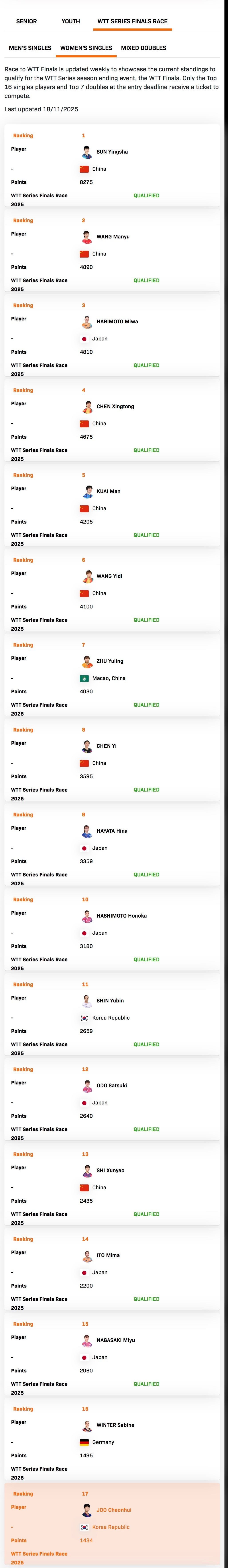 2025wtt香港年终赛女子单打16位运动员全部来自亚洲中国🇨🇳孙颖莎 王曼昱 陈幸同 蒯曼(首次) 王艺迪 陈熠(首次)石洵瑶(首次)日本🇯🇵张本美和 早田希娜 桥本帆乃香(首次)大藤沙月 伊藤美诚 长崎美柚(单打首次)韩国🇰🇷申裕斌 朱芊曦中国澳门🇲🇴朱雨玲(转会后首次)