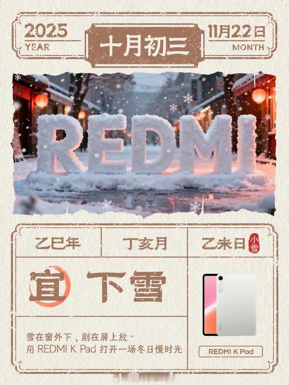 小雪宜宅家 用REDMI K Pad享慢时光❄️今日小雪(2025.11.22),窗外雪落,屋内暖意正浓——REDMI K Pad陪你解锁冬日休闲:大屏追剧、轻享影音,把雪天的松弛感拉满🌨️REDMI K Pad