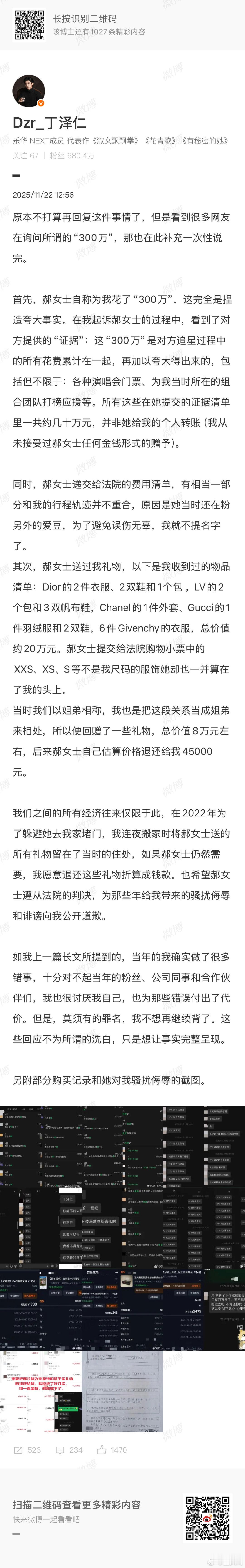 22日, 再发文回应“唯一的姐”相关争议,丁泽仁否认对方为他花了300万,并表示他愿意退还礼物和钱款:“也希望郝女士遵从法院的判决,为那些年给我带来的骚扰侮辱和诽谤向我公开道歉。”在丁泽仁晒出的聊天记录中,该女士多次喊丁泽仁“鸭”、“狗东西”,让他“自宫”、“去死”。
