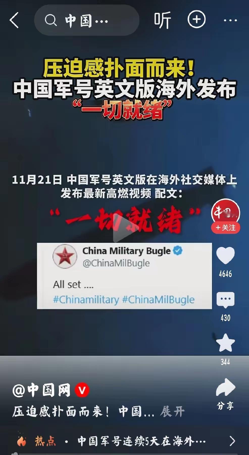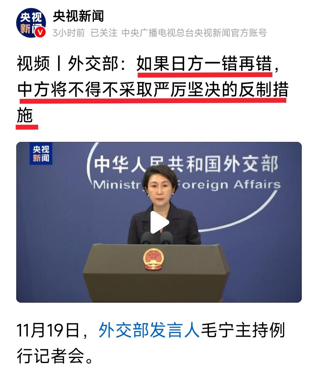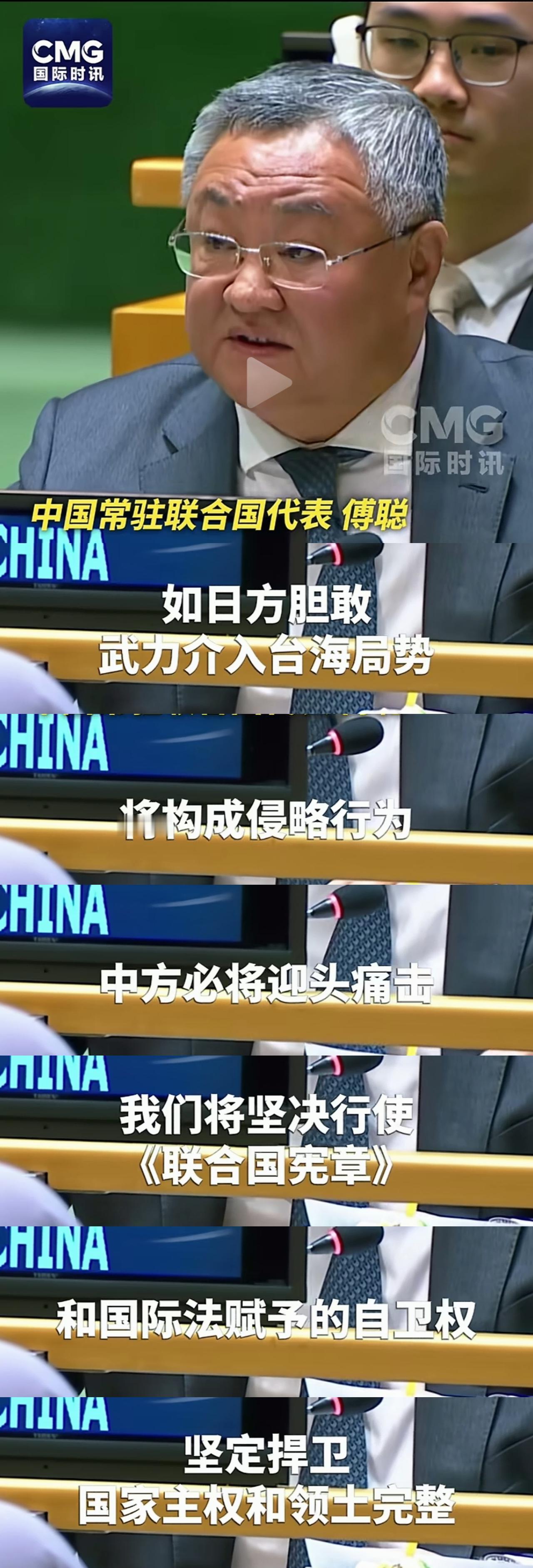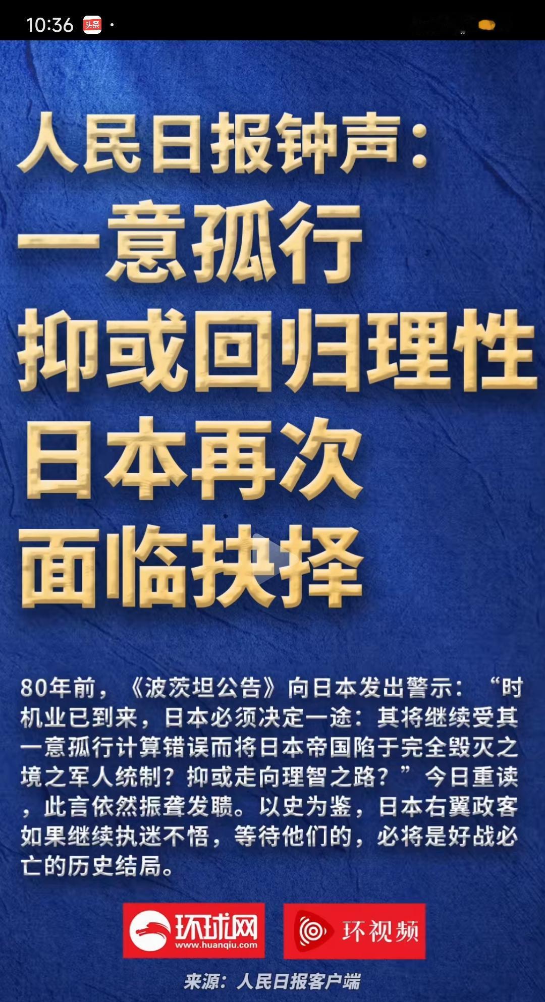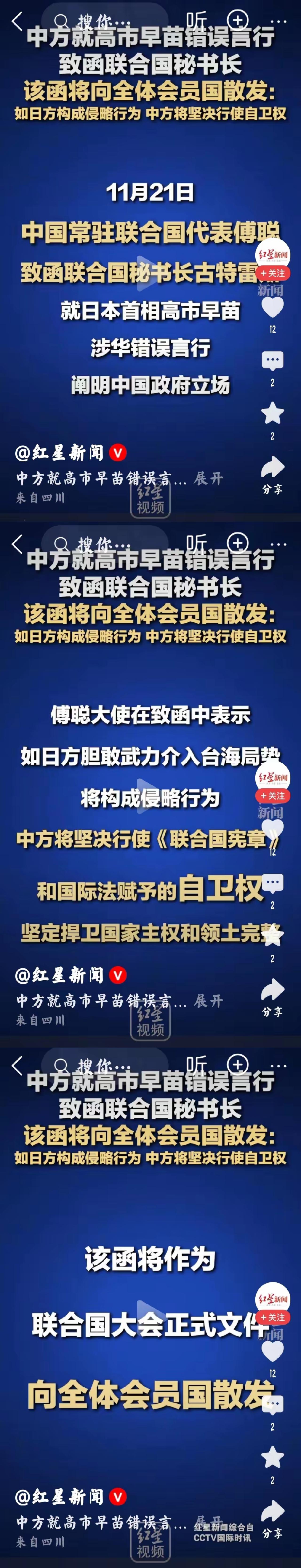 从高市早苗当选首相的那一刻就对她做出了正确判断——中方没有向她发贺电,只此一点就说明中方早已知道她是比安倍晋三更激烈的日本右翼分子,会比安倍晋三走的更远。高市早苗上台就对台海发出了就连安倍晋三都不敢说的“台湾有事日本会动武”这种话。不出所料!“不负期待”! 于是,中方的所有反应就上走流程——首先要求其撤回也在预判中的其绝无可能撤回的恶劣言论——高市早苗的拒绝促成中方进入下一步:外交部指责日本未彻底反省战争罪责、警告“如果日方一错再错中方将不得不采取坚决反制措施;接着国家媒体、各战区跟进:解放军报警告“日本将沦为战场”、中国军号发文:“一切准备就绪”、“等待‘东风’”;《人民日报》更是发出“日本再次面临抉择”的警告;再接着,我驻联合国特命全权大使傅聪致函联合国秘书长明确表示“如果日本胆敢武力介入台海局势将构成侵略行为,中方将坚决行使《联合国宪章》和国际法赋予的自卫权,坚定捍卫国家主权和领土安全”,此函向联合国所有成员国散发。 至此,文的流程已经走完。 文的流程走完这事就完了吗?不会。下一步就是逼迫日本兑现其首相高市早苗“台湾有事日本会动武”的承诺。看吧、等吧——“一切准备就绪”——武的流程也准会来。