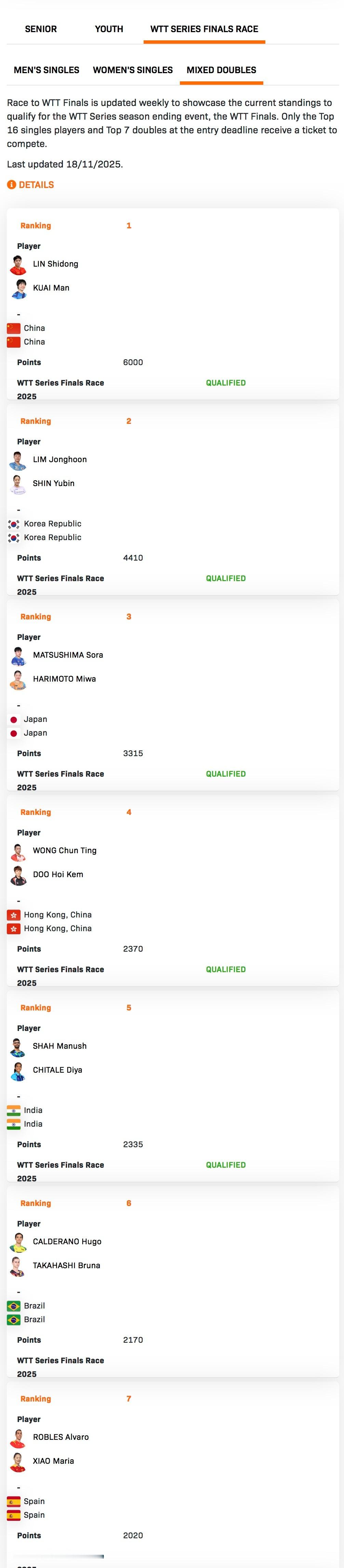 2025wtt香港总决赛以下7组混双获得参赛资格1 林诗栋/蒯曼🇨🇳2林钟勋/申裕斌🇰🇷3松岛辉空/张本美和🇯🇵3黄镇廷/杜凯琹🇭🇰5玛努什/奇塔勒🇮🇳6雨果/高桥布鲁娜🇧🇷7罗布勒斯/肖瑶茜🇪🇸余外卡一张