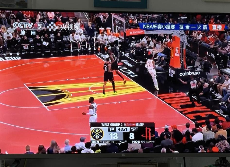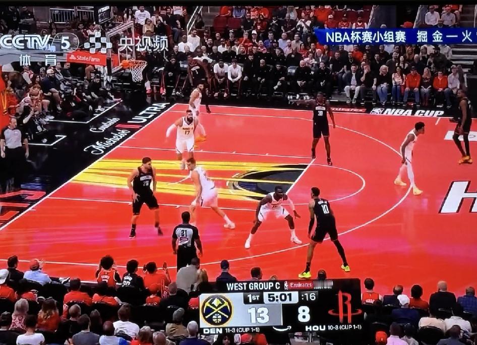 NBA是越来越不能看了 好久没看NBA 不知道是为了啥 这地板颜色搞成这么花 主场火箭球员 传球都好容易失误。