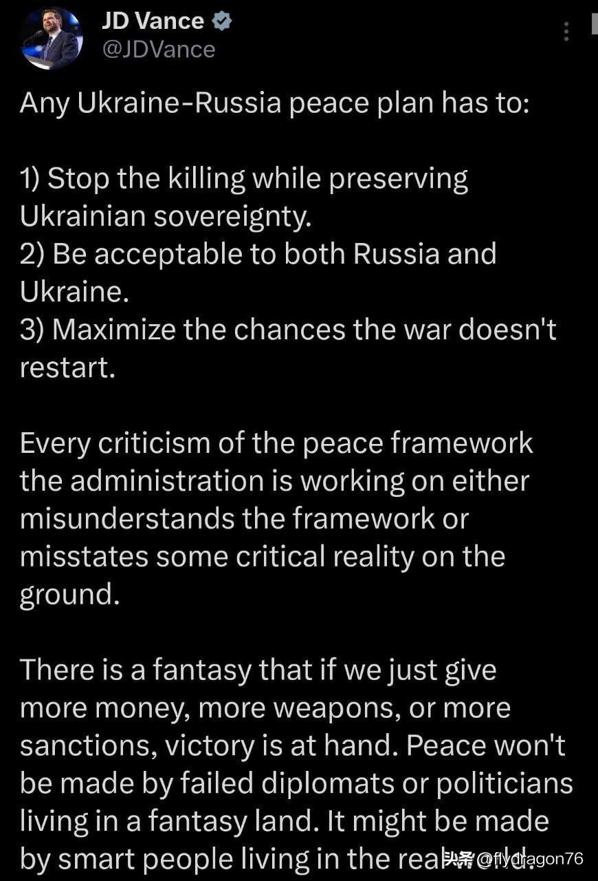 🇺🇸美国副总统JD·范斯表示,指望通过加强制裁和增加对乌克兰的军事援助来战胜俄罗斯是“幻想”。 范斯称,在寻求解决方案时必须考虑基辅和莫斯科的立场,他称那些批评正在制定的解决框架的人为“生活在幻想世界中的失败者”。 他列出了可能和平协议的主要要求: 1. 停止战斗,同时保持乌克兰主权。 2. 协议对乌克兰和俄罗斯双方都可接受。 3. 提高战争不再爆发的可能性。